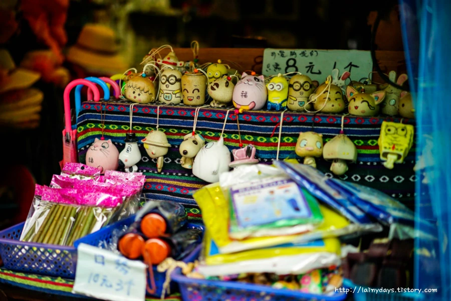 중국의 어느 시골마을이라고 뭔가 더러운 분위기만 생각해선 안된다. 이렇게 깔끔하고 예쁜 카페? 도 많다. 이런 아기자기한 물건들을 파는 가게도 많고. 어떤 곳은 삼청동? 인사동? 분위기가 나기도 한다. 의외로? 깔끔한 가게들은 사실 옛 모습을 걷어낸 상업화의 증거라 할 수도 있을까..