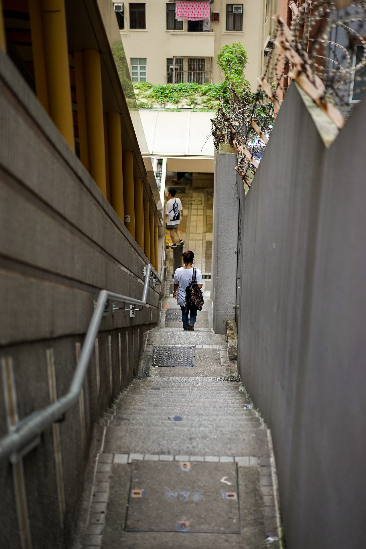 사진 중앙에 지붕처럼 덧씌워진 것 아래에 보이는 게 미드레벨 에스컬레이터다. 정말 끝 간 데 없이 이어진 모습. 정상에서 내려갈 땐 좁은 계단을 이용해 본다. 올라올 땐 천국이었으나 내려갈 땐 지옥이 펼쳐지기도 하는 게 미드레벨 에스컬레이터의 특징.