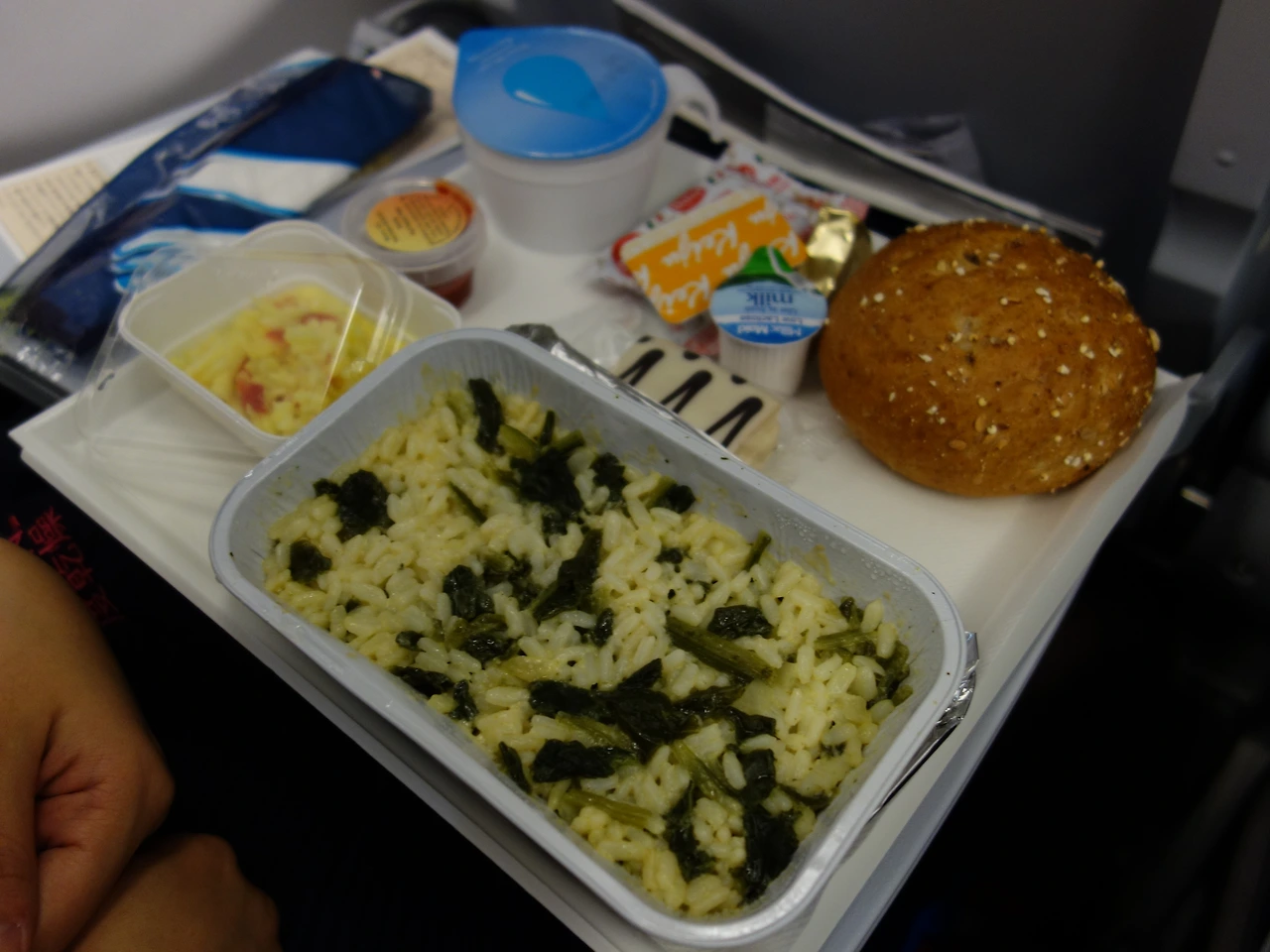 편도 약 9시간 비행이라 기내식이 두 번 나온다. 사진은 그중 첫 번째. 메인 요리로는 고기 볶음밥이 나왔다. 맛은..역시 그냥 그랬다. 고기가 야채에 파묻혀 잘 보이지 않는다.