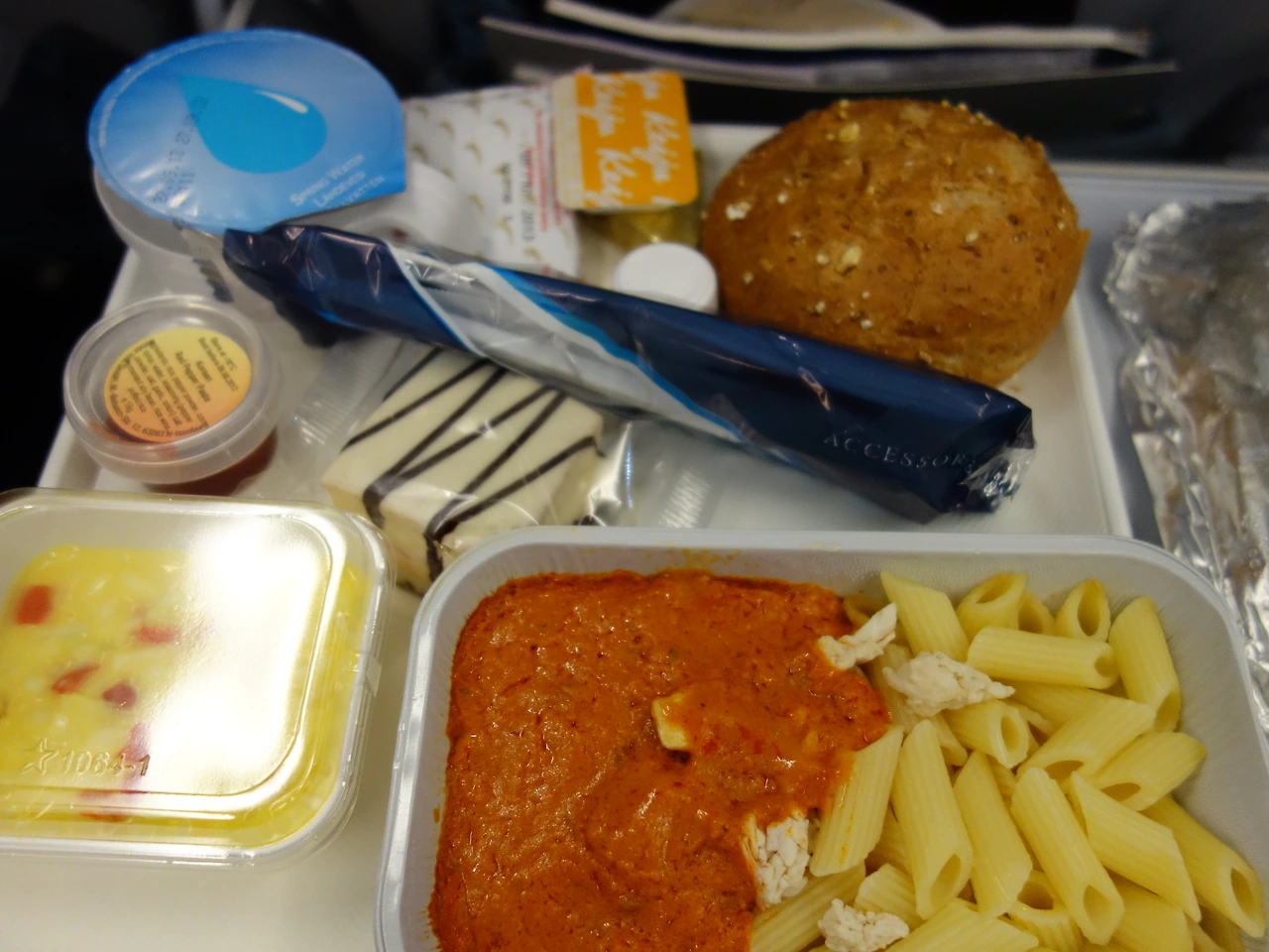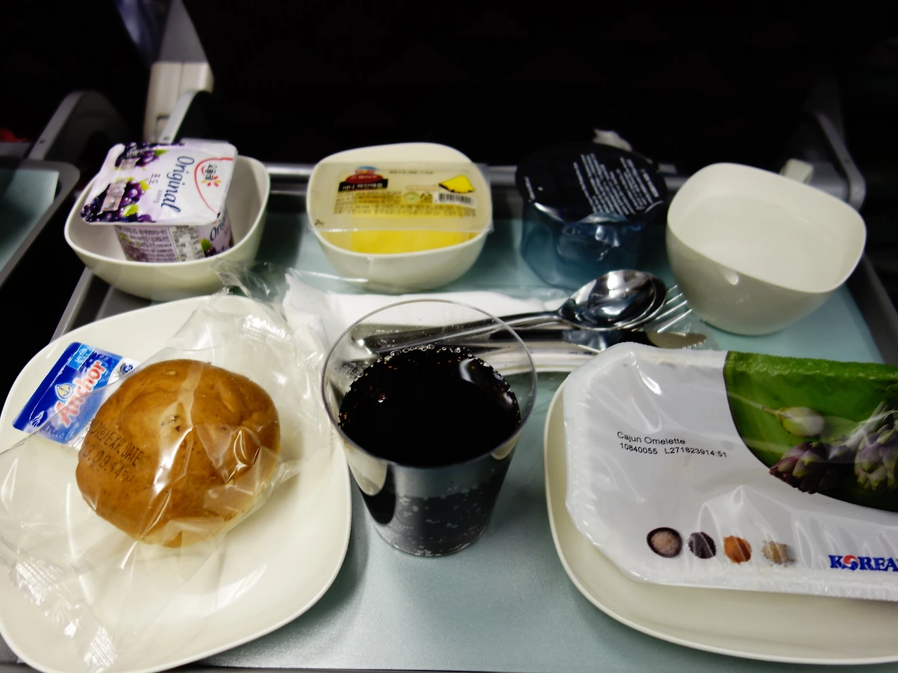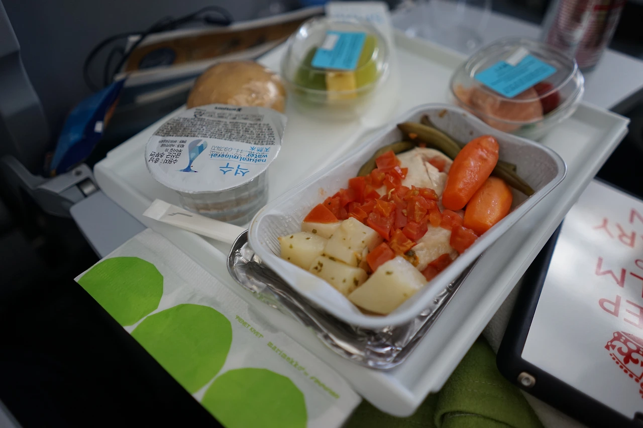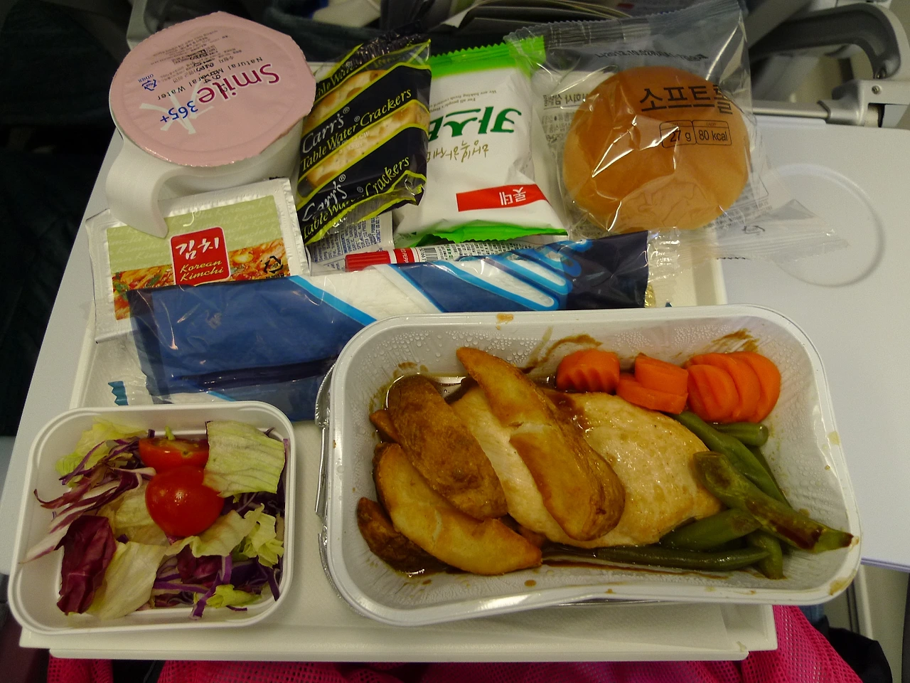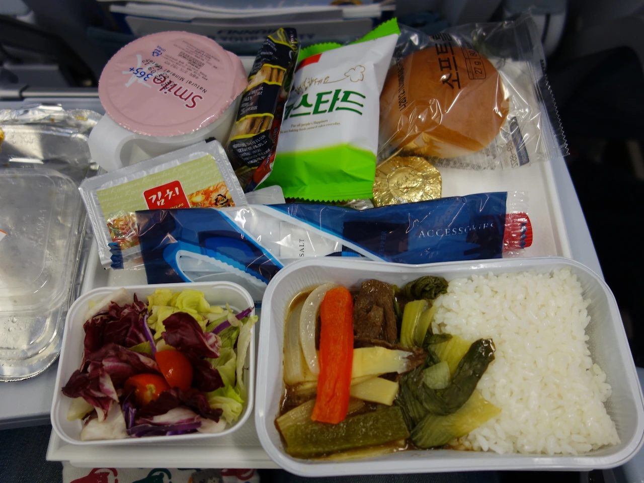2009년 홍콩 갈 때 대한항공에서 줬던 기내식보다 훨씬 업그레이드되었다. 특히 수저가 일회용이 아니라 있어 보이는 금속제를 준다. 일반 식당에서 먹는 느낌. 그리고 밥이든 간식이든 아래 그릇을 받쳐준다.