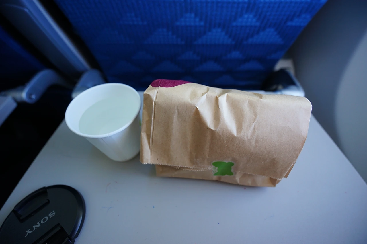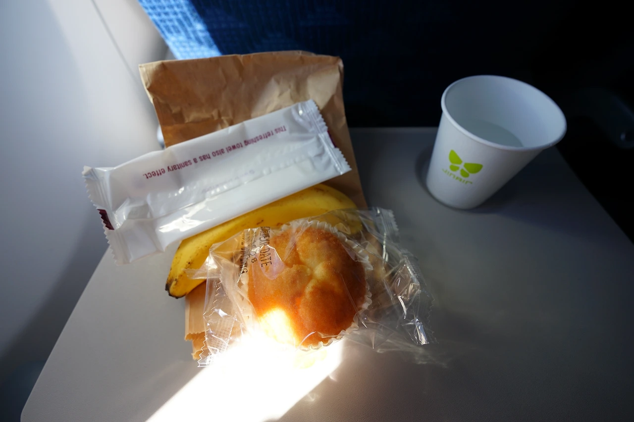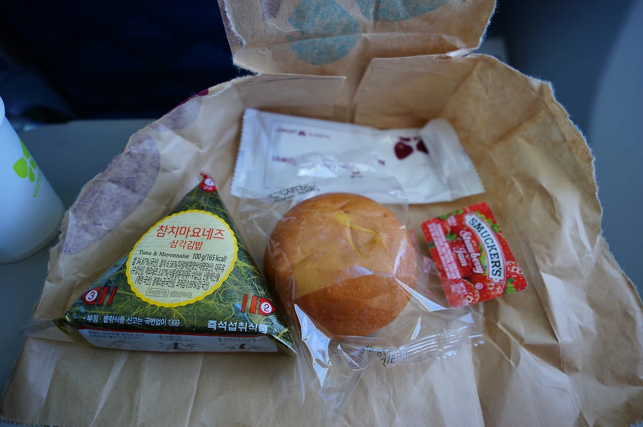 오키나와도 김포공항에서 2시간 반 정도면 도착하기 때문에 매우 간단한 식사? 간식?을 제공했다. 작은 종이봉투에 삼김(돌아올 땐 바나나), 빵, 잼 그리고 센스 있게 물티슈가 들어 있다.