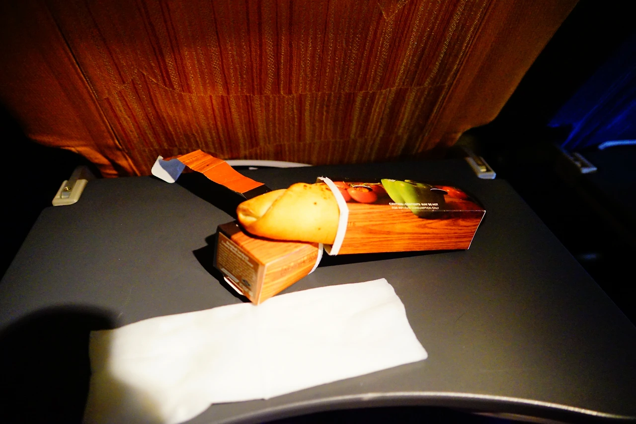 전 세계 모든 항공사들이 공통으로 쓸 것만 같은 저 작은 김치는 여기서도 보이고, 메인 요리 위에 올라간 빵은 그간 소프트 롤과는 모양이 달라서 이색적이었다. 맛도 괜찮았다. 마치 작은 바케트 빵을 먹는 느낌?