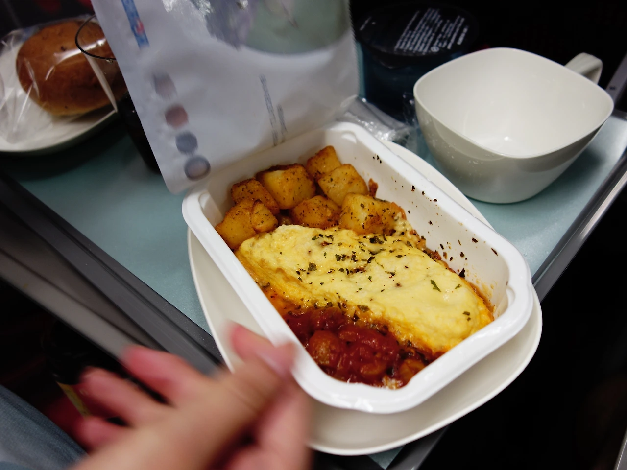 한국에서 홍콩을 갈 때엔 비행시간이 대략 3시간 남짓이다. 짧은 비행시간이기에 기내식도 딱 한 번 단출하게 나온다. 메인요리로는 데워져 나온 오므라이스가 나왔다. 맛은 그저 그랬다. 쟁반은 플라스틱 재질에 상당히 작은 크기. 사이드 메뉴로 소프트빵 한 조각과 버터, 그리고 오렌지 주스와 샐러드가 나왔다.