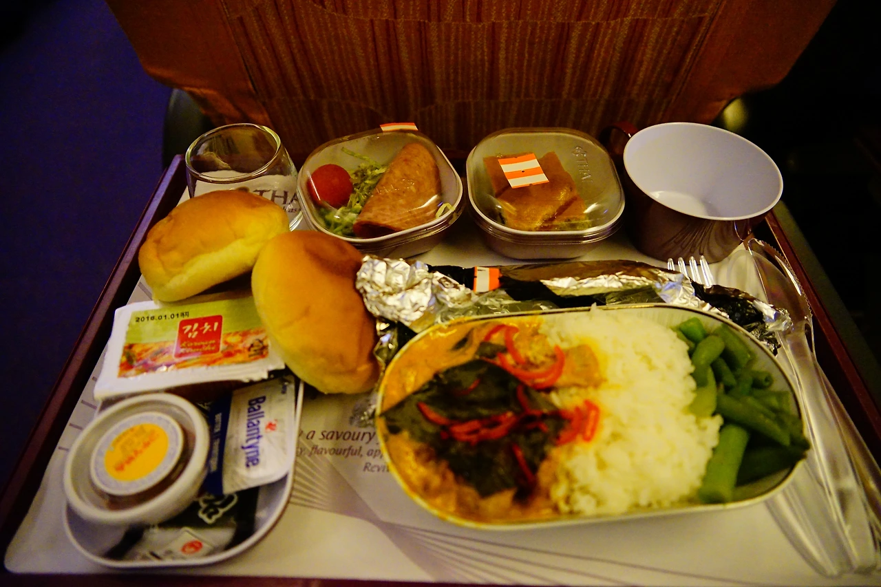 놀라운 건 얘네들이 전부 플라스틱 접시에 잘 정돈되어 담겨있다는 거? 그냥 나무 쟁반 위에 툭툭 두었으면 부피가 작아서 처치 곤란이었을 텐데. 타이 항공의 세심한 배려가 느껴진다.