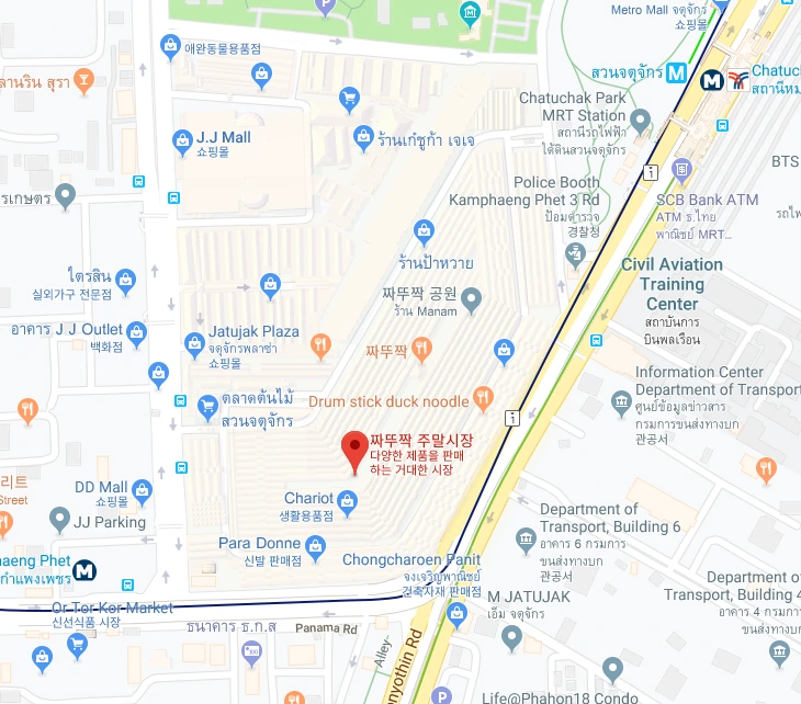 방콕에 여행 갔을 때 나는 필히 짜뚜짝 시장을 들르리라 맘을 굳게 먹었다. 이 시장은 방콕에서 가장 큰 시장으로 총 5천 여개의 점포가 있으며 하루 방문자 수만 20만에서 30만에 이른다고 추정되고 있다. 얼마나 크면 구글 지도에도 설명이 '다양한 제품을 판매하는 거대한 시장'이라고 되어 있을까
