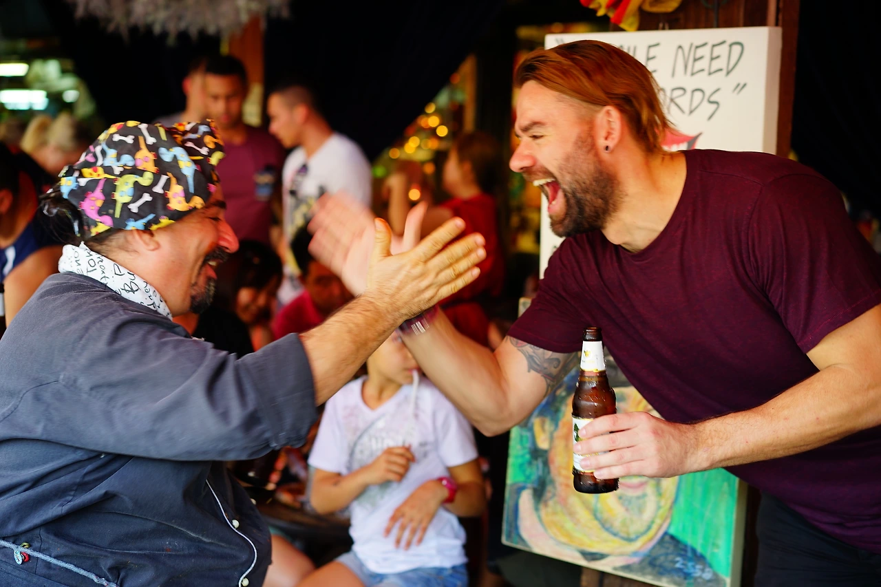 아저씨는 쇼맨 쉽도 굉장히 강하다. 지나가는 사람들 와 일일이 사진도 찍어주고 때로는 코에 맥주를 부어 입으로 마시는 묘기도 부려주신다. 사진의 압권은 뒤에 있는 여성분의 표정..