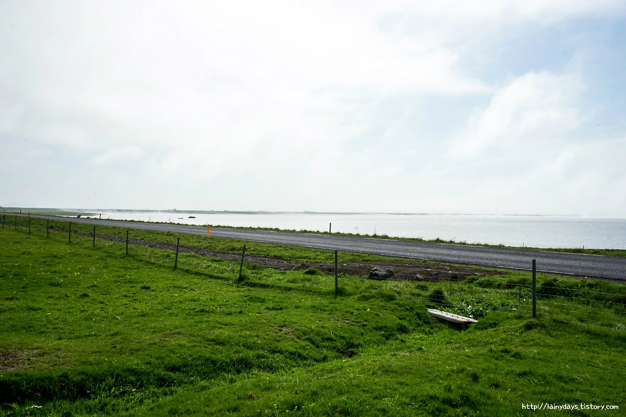 화산 폭발 지대를 지나 차를 타고 다시 셀랴란드 스포츠를 향해간다. 하지만 이런 멋진 풍경이 계속 펼쳐져 내 발목을 잡는다. 눈앞에는 광활한 대지와 살짝 오른 산 그리고 그 위를 살포시 덮은 안개.. 그리고 그 밑에서 평화롭게 풀을 뜯는 양 떼.. 그리고 바로 등 뒤로는 끝없이 펼쳐진 맑은 호수..