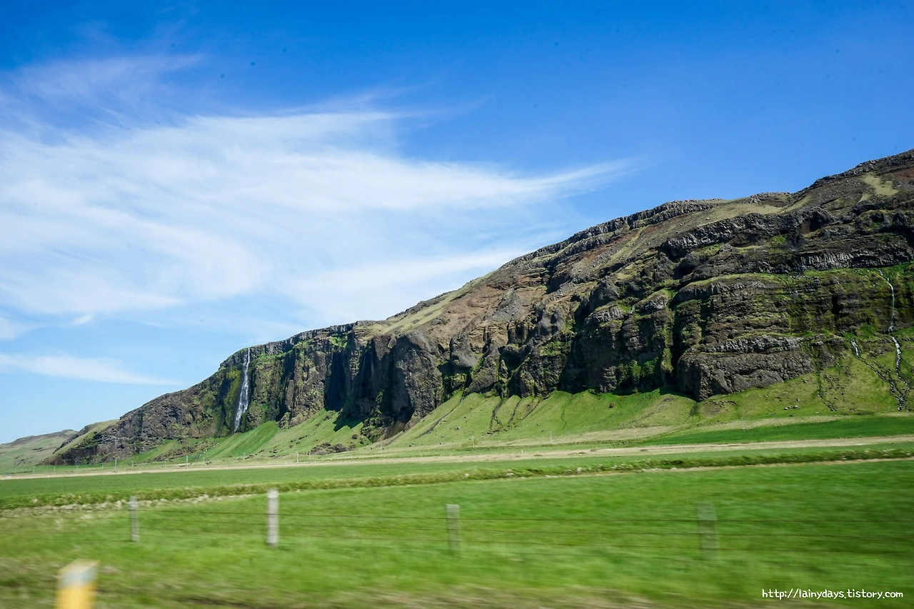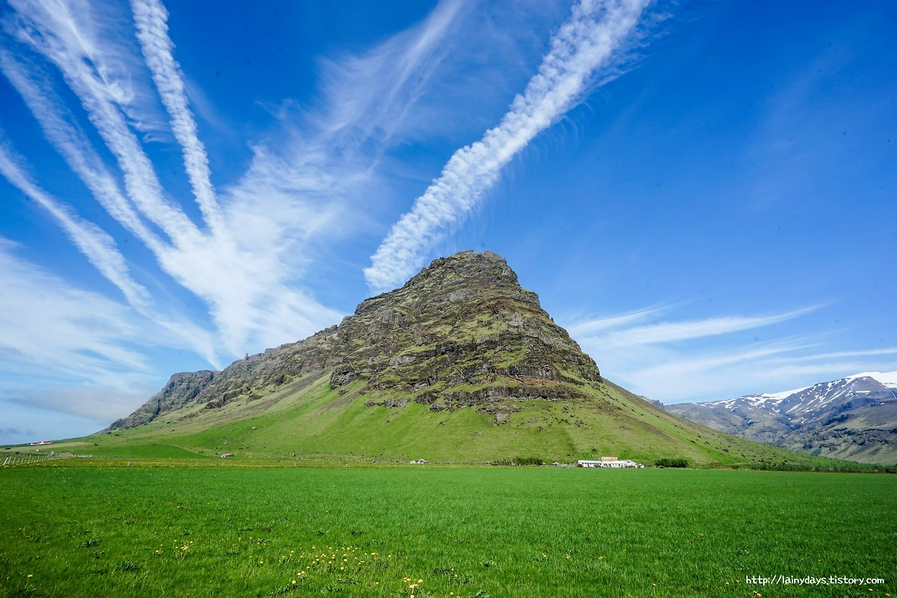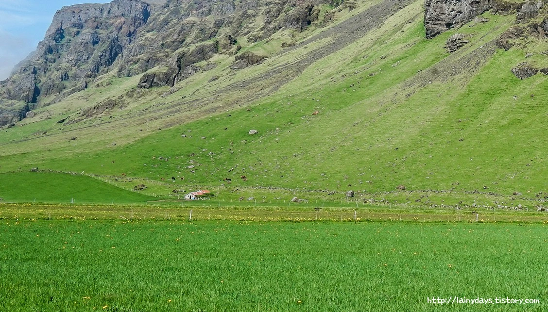 사진을 확대해서 자세히 보면 위에서부터 굴러 떨어진 거대한 암석들이 많다. 그리고 저기 보이는 집.. 아무래도 암석으로 인해 폐가가 되지 않았을까 싶다. 아이슬란드를 운전하다 보면 저런 위에서 굴러 떨어지는 돌들이 참 많이 있다. 위험해 보이기도 하고.. 그냥 자연스러운 것 같기도 하고..