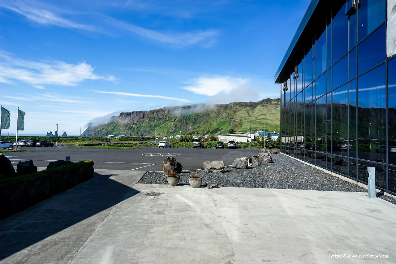 호텔에서 조금 걸어 나와 호텔 전경을 담아본다. 이렇게 멋진 곳에 호텔이 자리 잡을 수도 있구나 라는 생각이 절로 든다. 호텔 너머 언덕 위에는 vik마을을 상징하는 교회가 새빨간 지붕을 살포시 내밀고 있다.