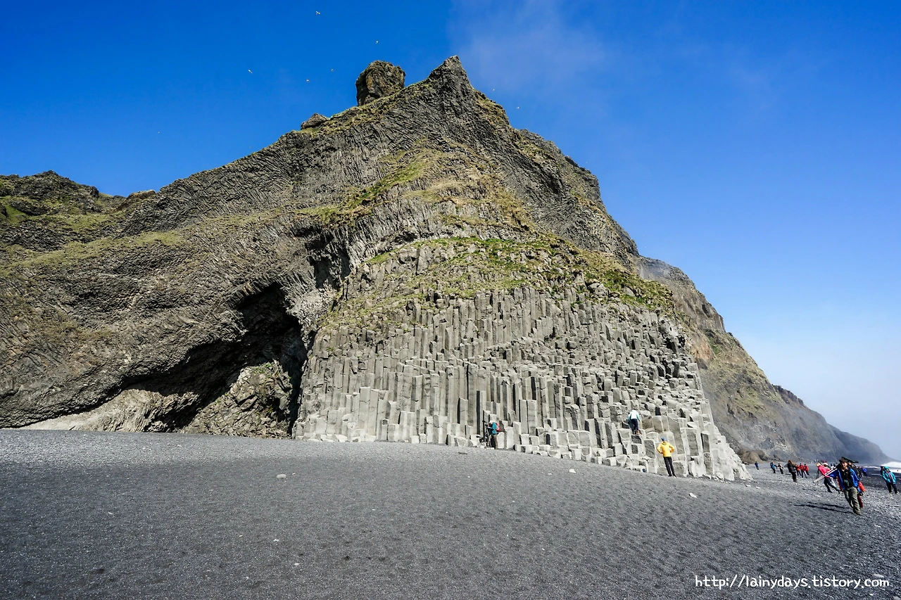 동굴 오른편으로 바다가 보인다. 그리고 사진 중앙에 뭔가 희뿌연 것이 보이는데 이게 바로 레이니스드란가르(Reynisdrangar)로 불리는 바위들이다.