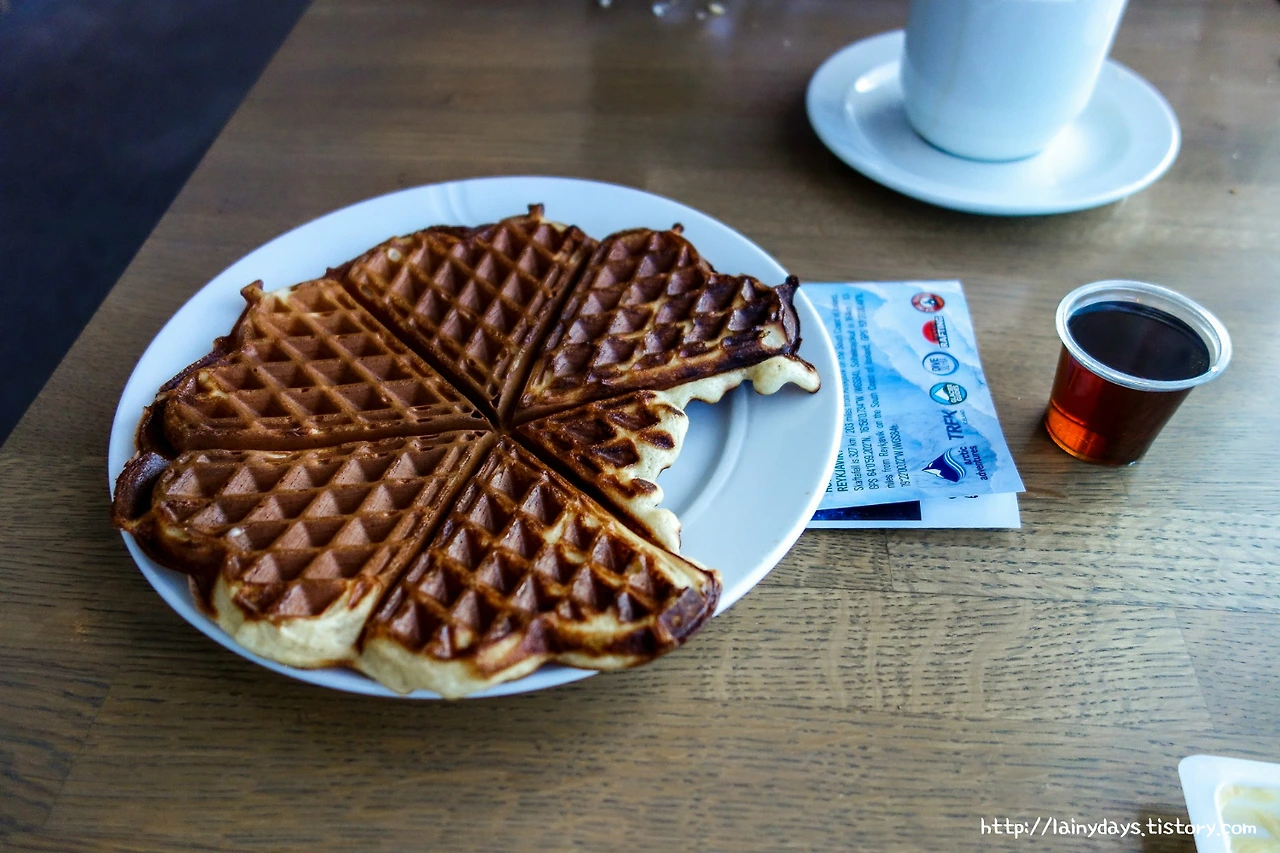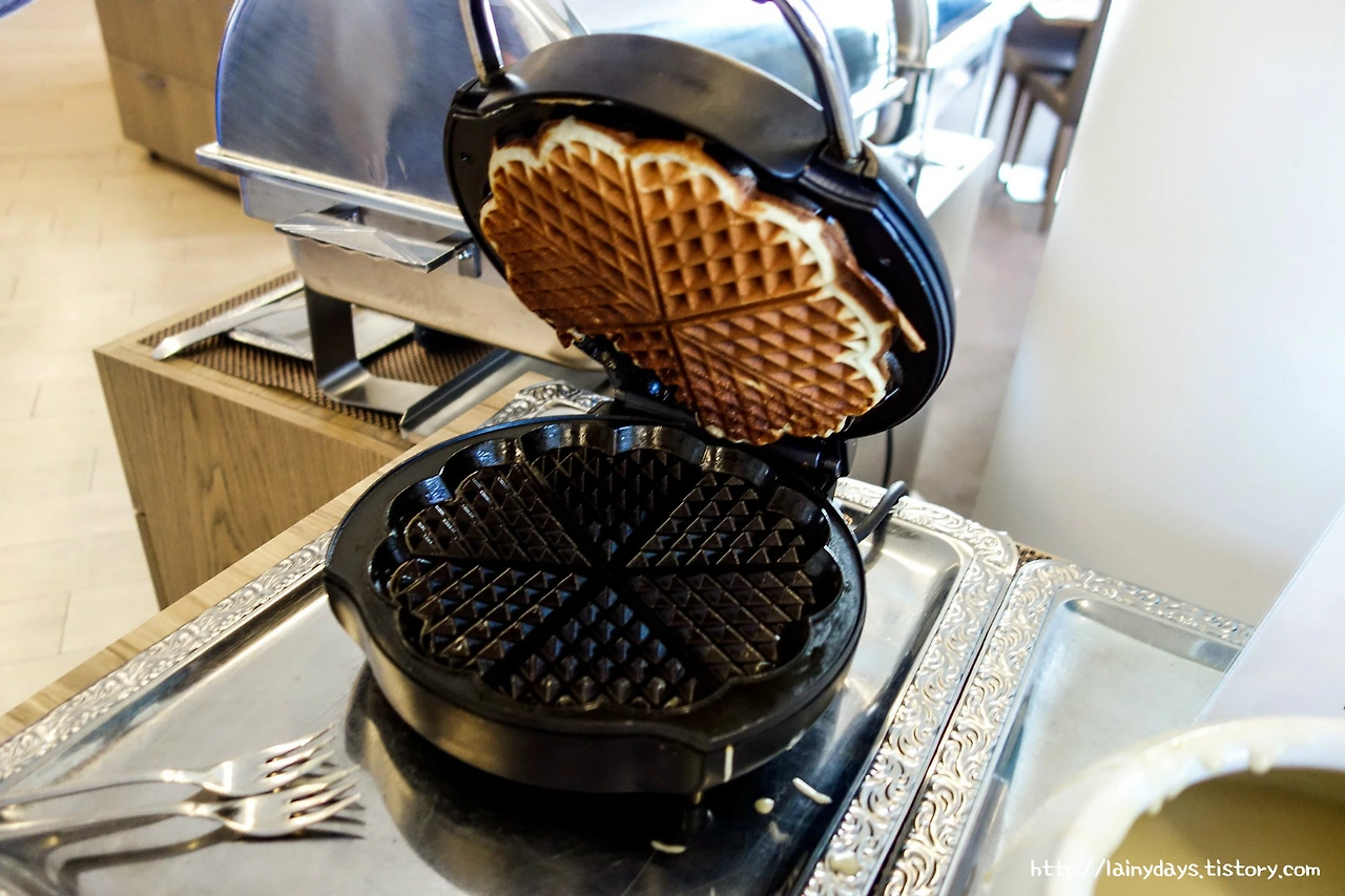 이 호텔 조식 메뉴 중 내가 가장 맘에 들어했던 것은 바로 이 와플(기계)이다. 직접 와플 소스를 구이틀에 부어서 만들어 먹을 수 있는데 이게 꽤나 생각보다 맛있었다. 아이슬란드 호텔 여기저기서 볼 수 있었는데 적당한 양을 붓고 적당한 시간에 빼내는 게 핵심이다.
