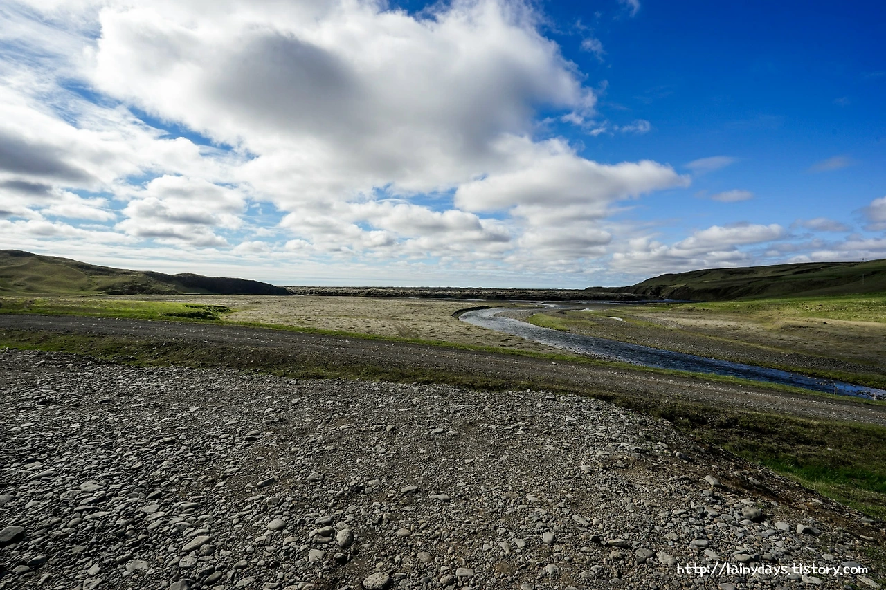 불의 나라 아이슬란드를 새삼 다시 느꼈던 카틀라 지오파크를 뒤로하고 진짜? 행선지인 Fjadrargljufur 협곡으로 향한다. 어느덧 회색빛 텁텁한 용암이 굳은 풍경은 온데간데없이 사라지고 푸릇한 들판을 잔잔한 강물이 가로지르는 평화로운 풍경이 나타났다.