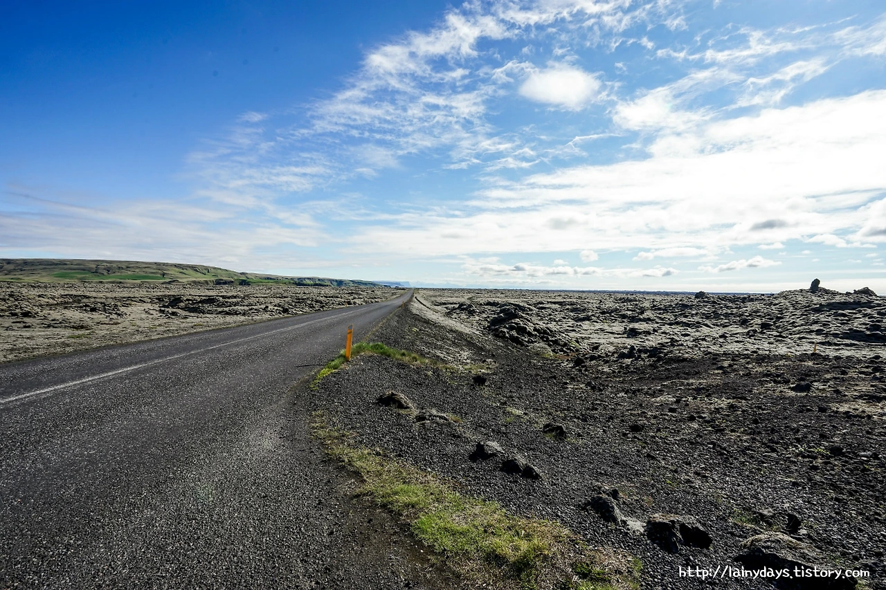 갓길 한쪽에는 뭔가 더 넓은 공간으로 연결되는 길이 보인다. 아마도 저기가 주차장인 것 같아서 차를 잠시 주차한다. 사실 이곳의 위치를 구글맵에서 표기하고 싶으나 그냥 비크에서 Fjadrargljufur 계곡을 향해 링로드를 따라가면 나와요..라고 밖에 할 수가 없다(...) 아니면 카틀라 지오파크를 검색하거나.. 아니면 skaftareldahraun를 검색하거나.