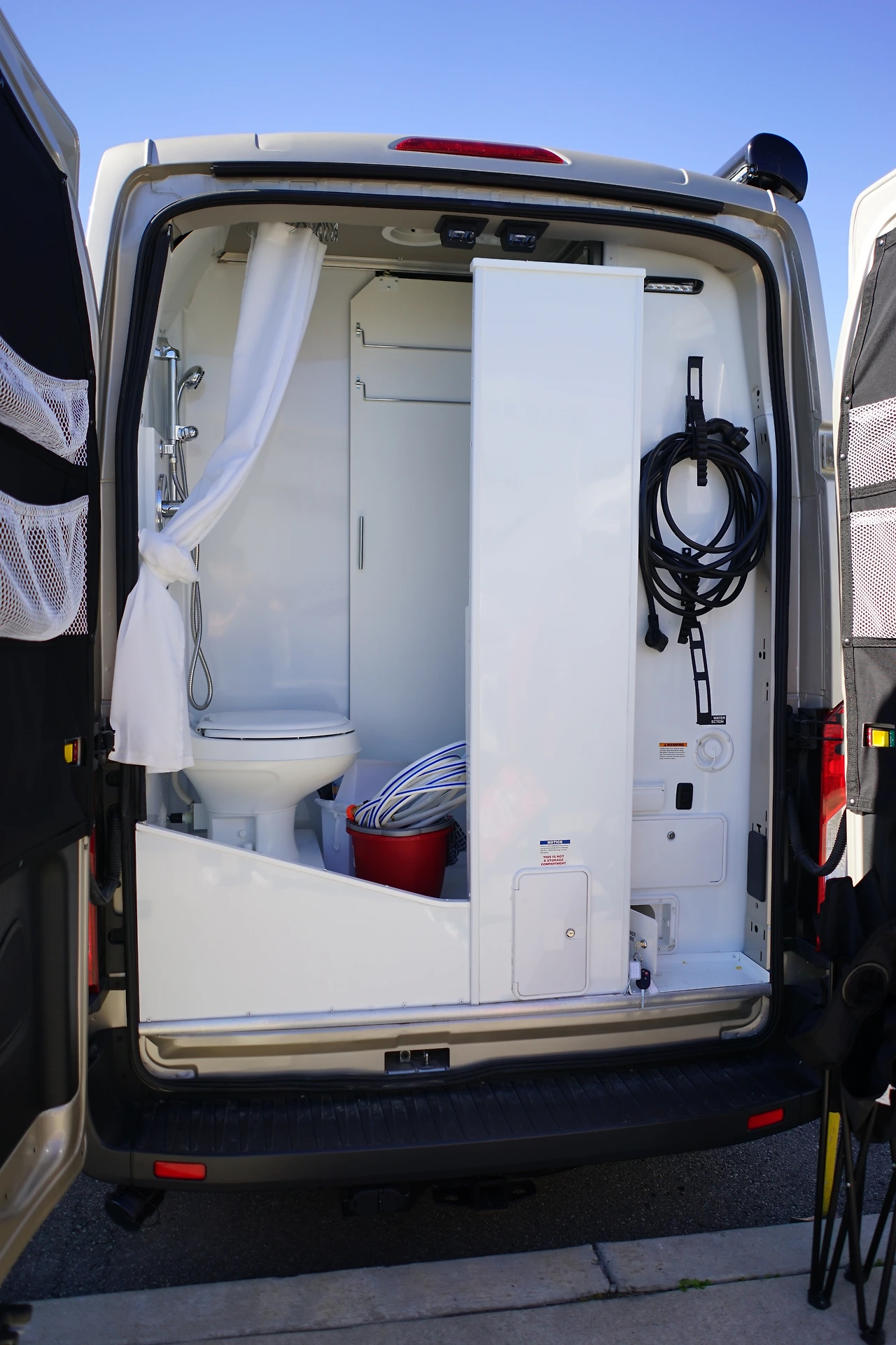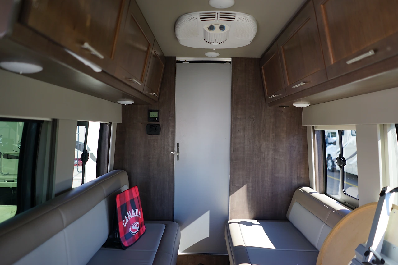 정면에 보이는 문이 화장실/샤워실 문이고 널찍한 소파는 조정하면 침대로 변한다. 거의 킹 사이즈 침대 수준. 실내 높이가 1.9미터라 웬만한 성인 남성은 일어서도 머리 공간이 충분히 남는다. 천장 양 옆으로는 수납장이 있다. 꽤나 공간이 넓어서 이것저것 쑤셔 넣기 좋다. 저 소파 아래에도 수납공간이 있다. 생각보다 많은 물건들을 차에 담을 수 있다. 고심해서 차를 설계한 티가 난다.