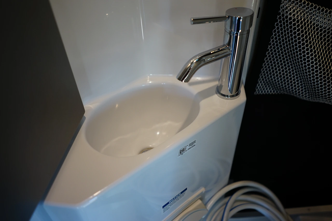 화장실이 어떨지 정말 걱정 많이 했는데 생각보다 깔끔해서 안심되었다. 하지만 작은 캠핑카 안에 있을 거? 다 있는 화장실을 만들다 보니 너무 비좁았다. 그래서 출발 전, 샤워 같은 건 캠핑장 내 시설을 이용해야겠다고 생각했는데 의외로 캠핑카 내부 화장실을 자주 이용했다. 세면대는 화장실이 작은 만큼 쁘띠 사이즈다. 여기서 세수도 하고 양치질도 했다. 문득 그립네 호텔로 치면 7박을 한 곳에서 한 셈이니 정들 만도 하지..
