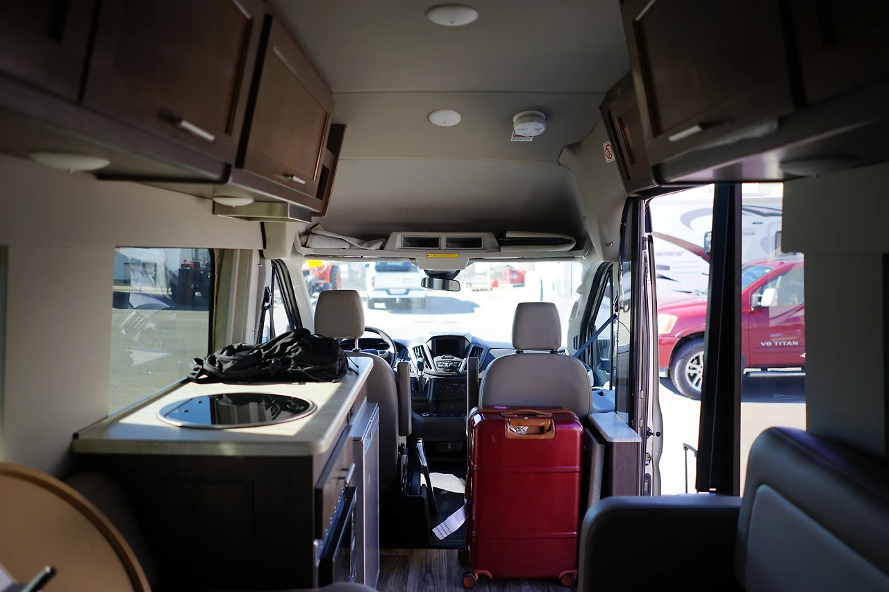 뒤를 돌아보면 캠핑카 앞부분이 보인다. 왼쪽에 싱크대와 가스레인지 그리고 그 아래로 전자레인지와 냉장고가 보인다. 운전석과 바로 연결된다. 운전석 바로 위에도 무언가 수납할 수 있는 공간이 충분히 많다.