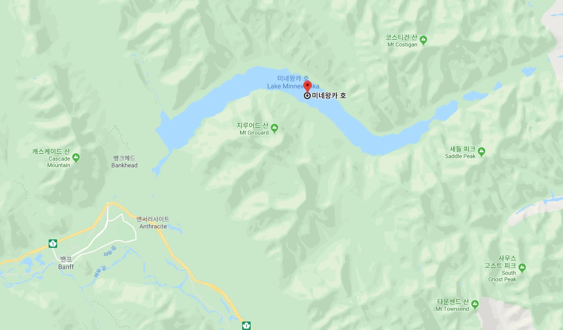 벤프를 뒤로하고 떠난 행선지는 미네완카 호수. 벤프 국립공원에 있는 많은 호수 중 가장 큰 규모를 자랑한다. 길이가 무려 21km에 달한다. 위 지도를 보면 알겠지만 일개 마을을 수 개 합친 것과 맞먹는 크기다.