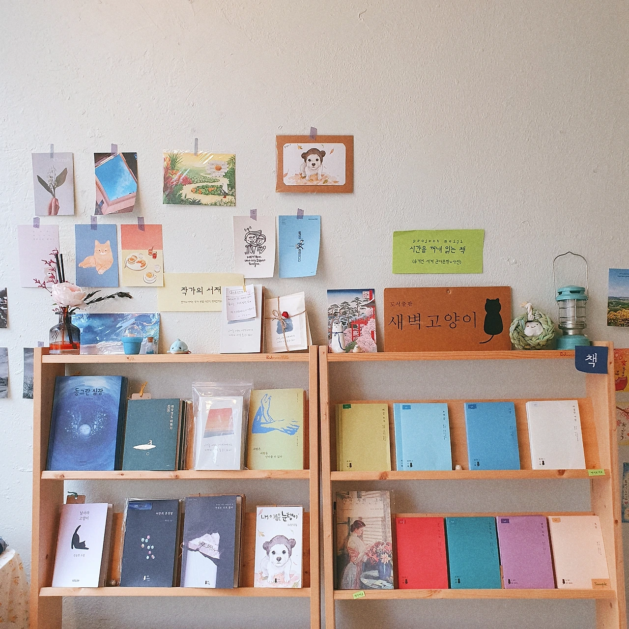 그 동네에 그 서점. 서점마다 특유의 분위기가 있으니 쉽게 잊을 수 없다. 우여곡절 끝에 도착한 새고서림은 새벽고양이란 독립출판사 사장님이 운영하시는 서점이다. 일본 문학 번역도 하시고, 글도 쓰시는 것 같았다. 대형서점에서 볼 수 없는 독립출판 서적들이 한가득이었다. 작은 크기의 단문집과 산문집 사이에서 고민하다가 '유서로부터' 라는 5페이지짜리 수필을 샀다. 자꾸 눈이 가던 벽면의 카드 하나도 (살 수 있냐고 재차 여쭤봤다가) 선물로 받았다(꼭 다시 가겠습니다 사장님!).