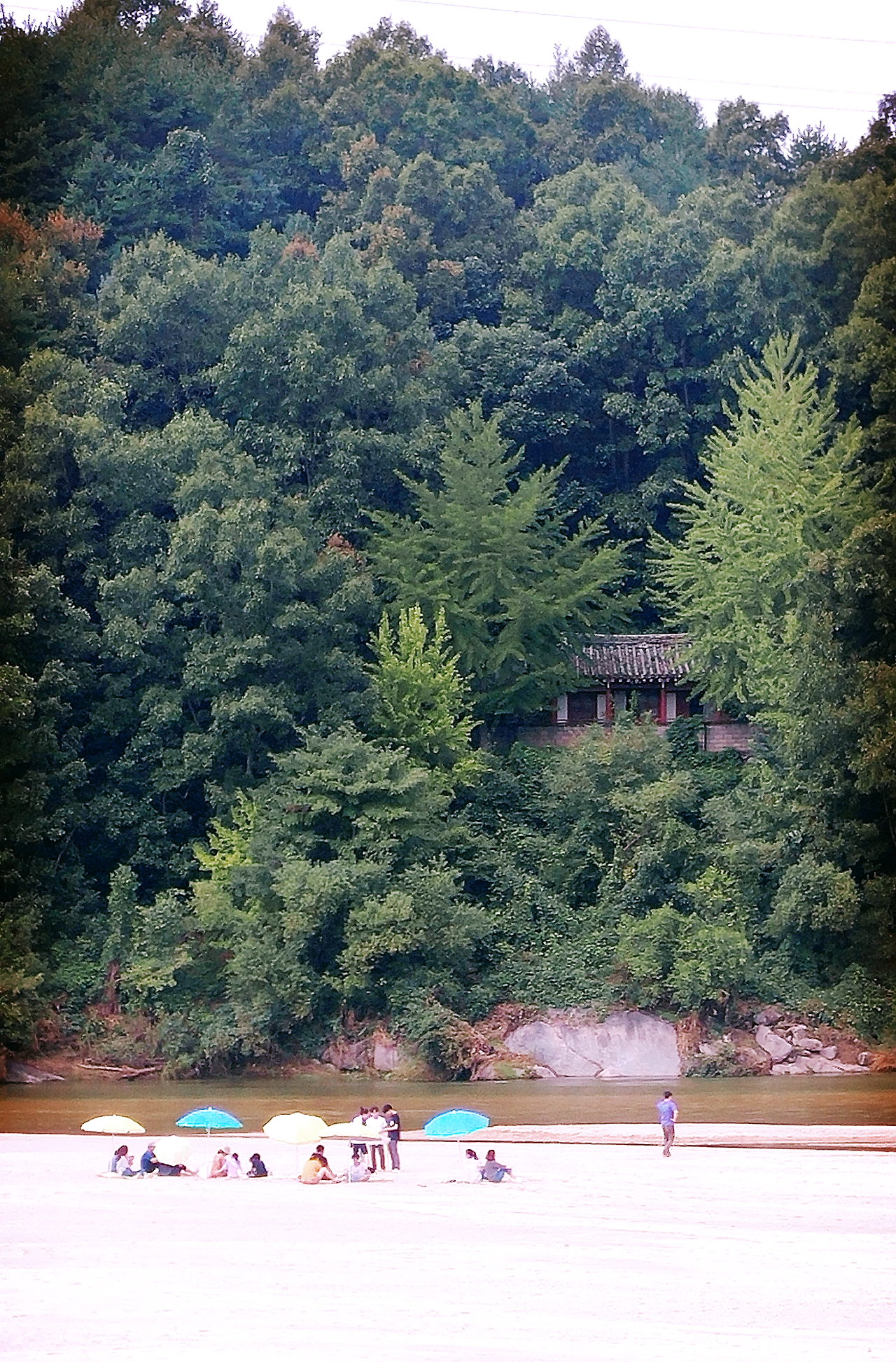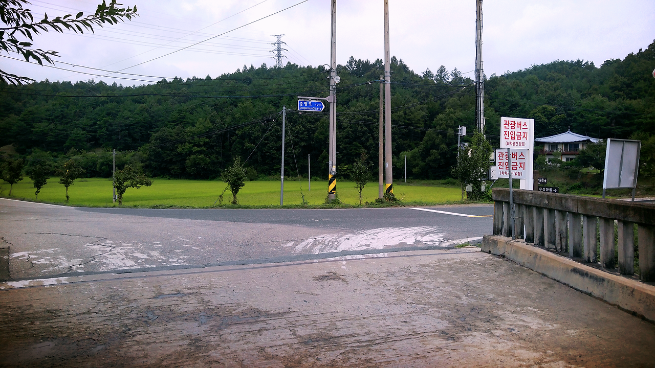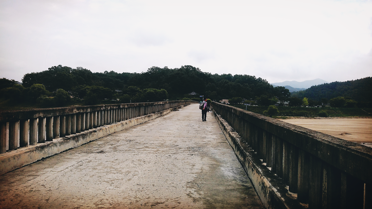 이 때부터 나는 1km 정도는 걸어야 될지도 모르니 미리 마음을 먹고 비장의 여행스킬인 ‘주변 사람 살펴보기’를 시작했다. 이 스킬은 대학교에 입학해서 처음으로 친구와 함께 해외여행을 갔을 때 유용하게 써먹은 스킬이다. 우리는 정말 아무런 계획도 없이 비행기를 타고 목적지인 일본 후쿠오카에 도착했다. 가장 기본적인 것이라고 할 수 있는 유명 관광지나 교통 수단 등을 하나도 알아보지 않고 떠났다. 관광을 할 때는 주위를 살펴본 뒤 한국인처럼 생긴 사람을 따라다녔다. 그런데 의외로 제대로 된 여행을 했고 이 때의 경험을 토대로 후에 유럽여행을 할 때도 이 스킬을 자주 써먹었다. 물론 몇 번은 실패하기도 했지만 지금 산골짜기를 돌고 도는 버스 안에서 자칫하다가는 외지고 위험한 곳에 혼자 내려 기억에 깊이 남을 고생을 하게 될지도 모르는 이 상황에 내가 할 수 있는 건 버스 안에 탄 승객들을 살펴보는 것뿐이었다. 우선 봇짐을 진 할머니나 헐렁한 옷을 입은 할아버지는 대상에서 제외했다. 그들은 무섬마을에 가는 것처럼 보이지 않았다. 남은 사람은 등산복은 입은 아저씨와 배낭을 맨 아저씨 둘 뿐. 여자 혼자 여행하는 상황에 믿어 볼 만한 사람이 아저씨들밖에 없어서 불안감이 조금 더해졌지만, 내 직감만 믿고 이상한 곳에서 내리느니 누구라도 따라 내리는 게 나을 것 같았다. 정 불안하면 버스에 계속 앉아 되돌아가면 되었다. 물론 이럴 경우에는 이번 여행을 결심한 내 자신을 탓하고 앞으로의 여행을 단념하며 속상한 마음으로 집에 되돌아 가겠지만. 그렇게 계속 눈치를 보고 있던 중에 부석사 정류장이 버스 노선의 종점이었던 것처럼 무섬마을 정류장도 종점이 아닐까 하는 생각이 들었다. 그리고 내가 지켜보단 두 사람도 왠지 종점처럼 보이는 회차로에서 내렸다. 더 이상 방법이 없었다. 나도 재빠르게 일어나 뒤따라 내렸다. 사진에서처럼 그곳에는 초록색 논과 길게 놓인 다리뿐이었지만 다리 밑으로 깔린 백사장을 보아하니 무사히 무섬마을에 도착한 것 같았다. 먼저 내린 두 분은 자연스럽게 다리를 건너갔다. 나도 그들을 따라 다리를 건넜다.