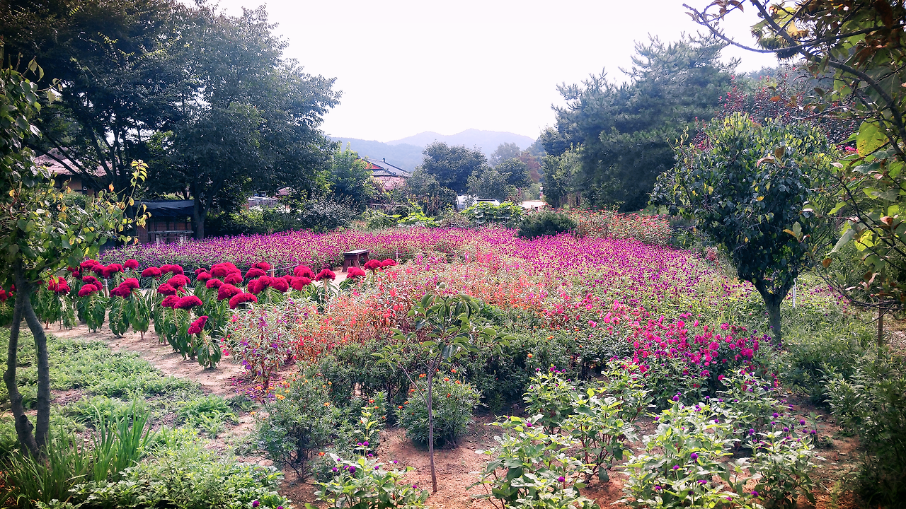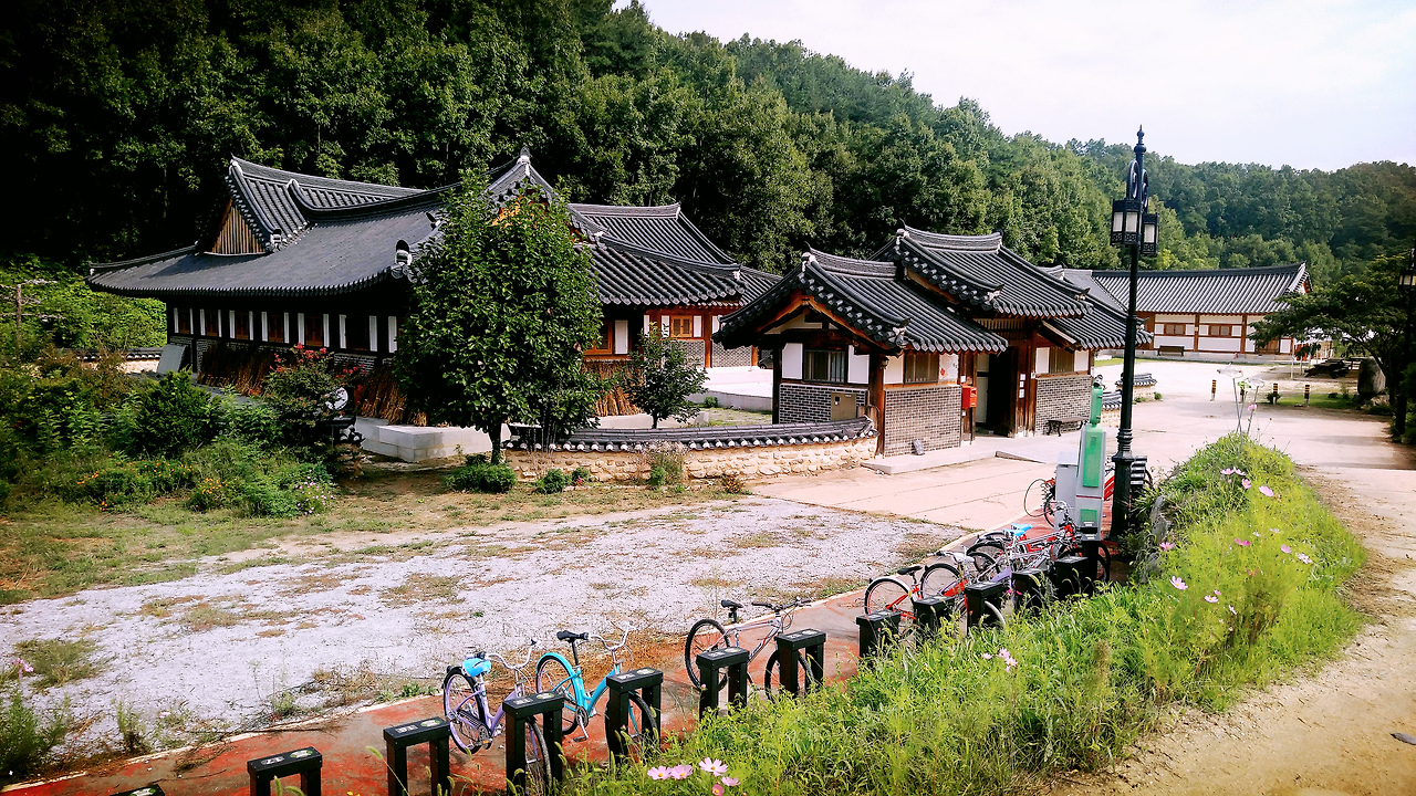 우연히 만난 얼룩고양이 한 마리와 푸른 나무에 둘러싸인 기와집과 초가집, 그냥 지나칠 수 없는 꽃밭과 이렇게 먼 곳에도 마련된 공용자전거. 세세하게 보자면 오래 볼 수도 있을 만한 것들이 많았지만 사람이 사는 집을, 그것도 추석 전에 온 가족이 몰려와 인사를 드리고 있는 집들을 들여다 볼 수는 없었다. 막걸리와 소주를 주 메뉴로 걸어놓은 곳에 혼자 들어가 커피를 마시는 여유를 부리기도 민망해서 자료 전시관을 구경하다가 강변에 위치한 벤치에 앉아 시간을 보냈다. 천천히 걷는다고 걸었지만 무섬마을이 생각보다 작아서 다음 버스가 올 때까지 1시간 30분 정도를 기다려야 했다.