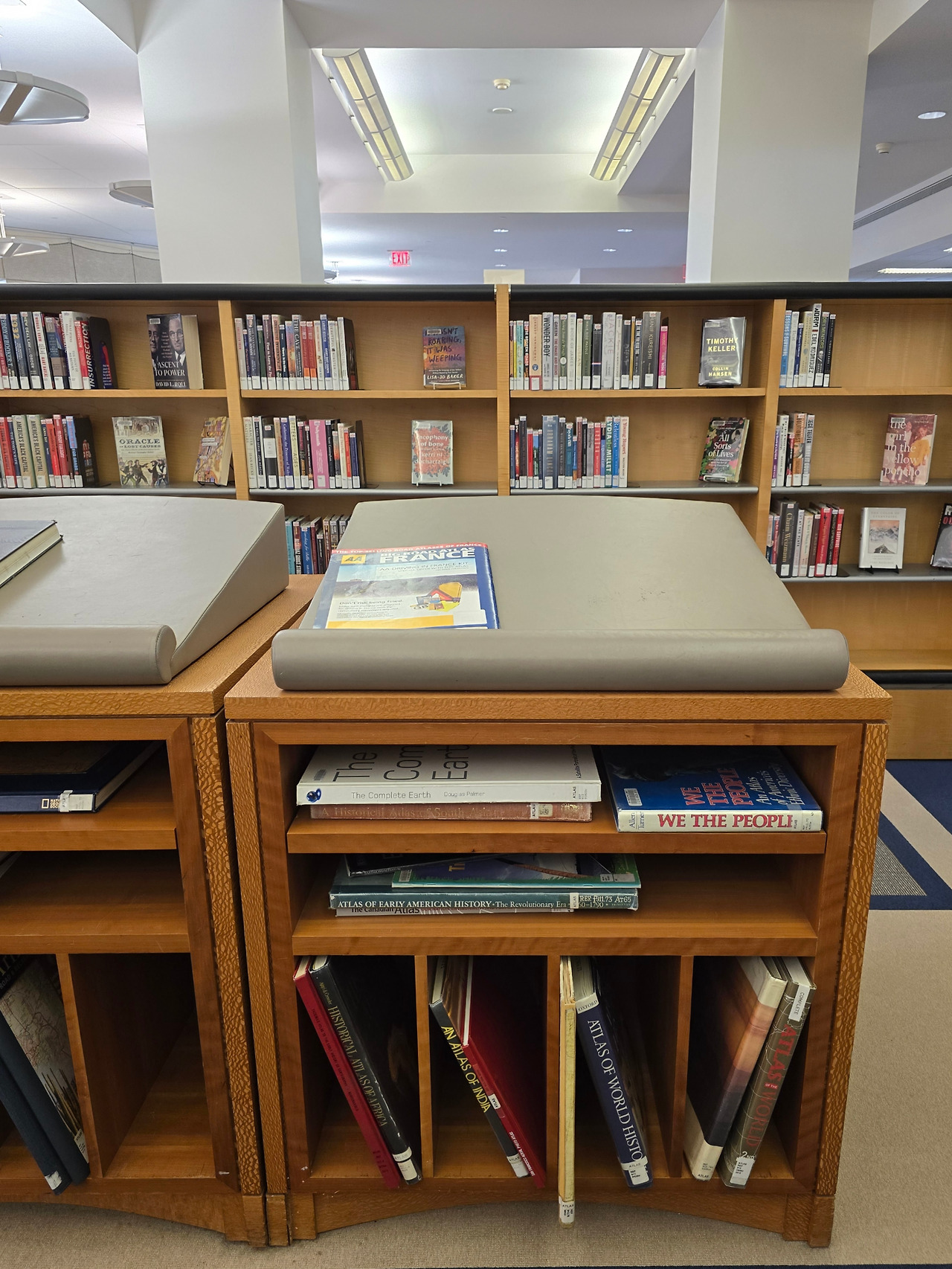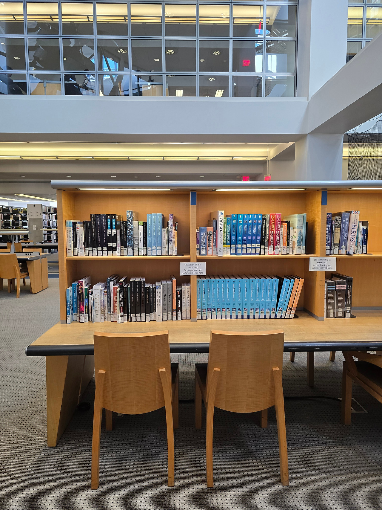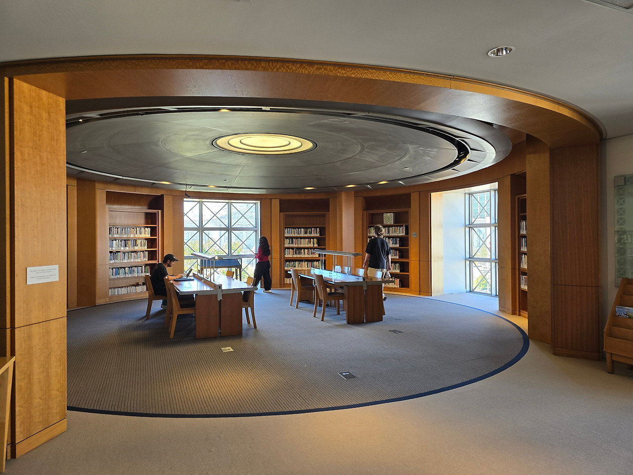 열람실의 또 다른 포인트는 책장마다 전등이 장착되어 조명의 사각지대 없이 둘러볼 수 있다는 점이다. 도서관 중심부의 유리벽은 실내에도 불구하고 답답하지 않은 인상을 준다. 크기가 큰 책 선반엔 받침대가 마련되어 있어 서서 바로 펼쳐보기 편했다. 책장이 붙은 테이블도 있었는데, 앉았을때 책으로 가려진 시선이 주변과 단절되는듯한 경험을 주면서도 답답하지 않았다. 일반적인 벽과 달리 책들이 꽂힌 벽은 그 세계의 공간이 펼쳐지면서 벽을 투과하는 느낌을 준다.