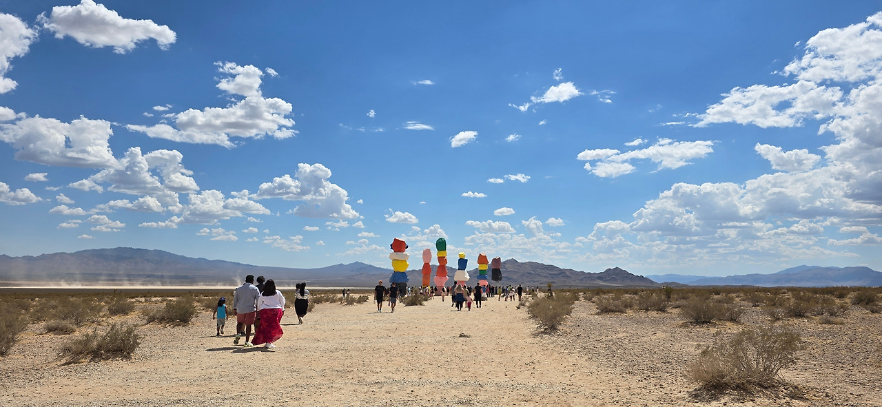 라스베가스에서 국립공원으로 이동하던 중 BTS 촬영지로 유명한 세븐 매직 마운틴을 방문했다. 내심 버닝맨을 가고 싶었지만 여건상 못 갔던 아쉬움을, 거대한 돌덩이들이 탑처럼 쌓여있는 이곳이 소형 체험 버전이라 생각하고 달래기로 했다. 조형물과 멀찍이 떨어진 파킹존에 내려 발을 몇 걸음 내딛자 땅바닥에서 올라오는 뜨거운 열기에 다리가 익을 것만 같았다. ‘이대로 가도 괜찮은 걸까?’ 망설임이 무색하게도 눈앞에 펼쳐진 장면은 장관이었다.