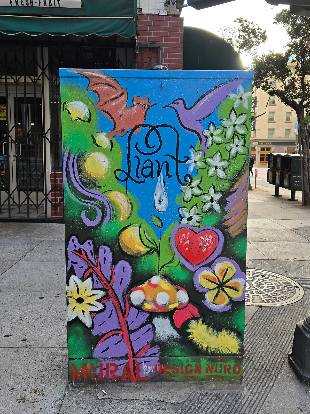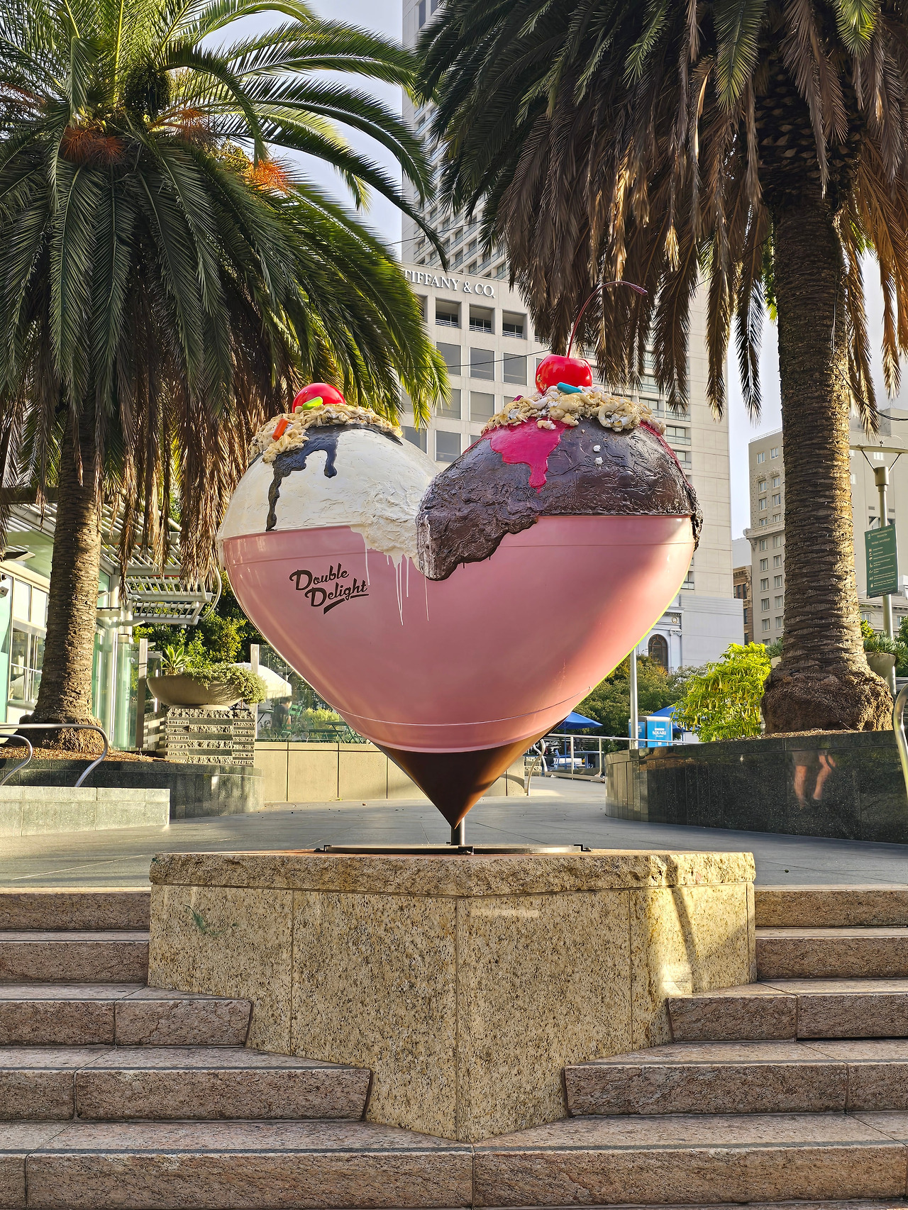 3박 4일의 마지막 날에는 요세미티로 출발하기 위해 아침 일찍 유니온 스퀘어 광장으로 향했다. 마주 보는 새와 박쥐가 그려진 패인팅, 달달한 도넛 데코의 하트 동상이 보였다. 우연히 발견한 이 동상은 샌프란시스코의 상징적인 설치물로 매번 데코레이션이 달라진다고 한다.