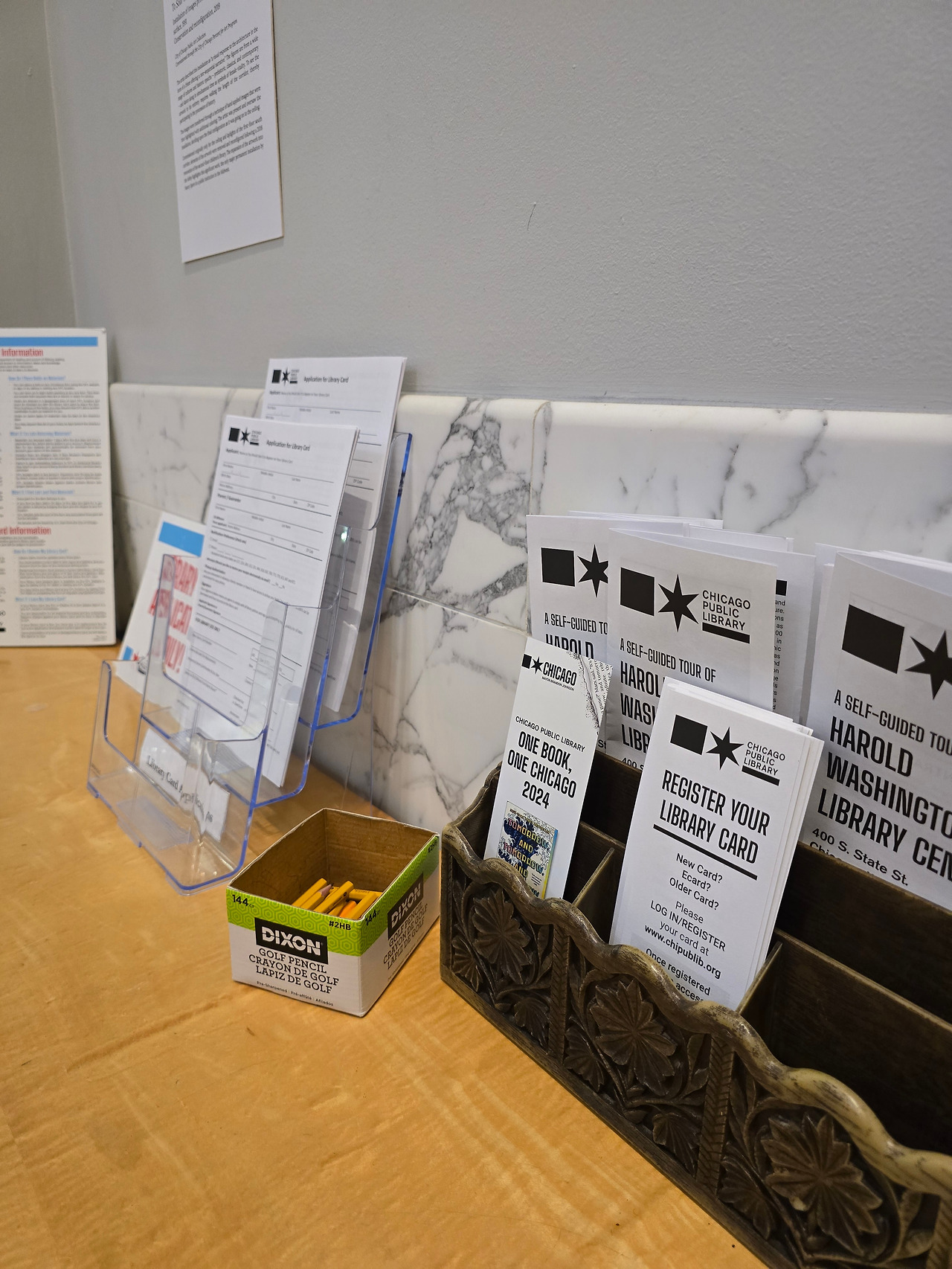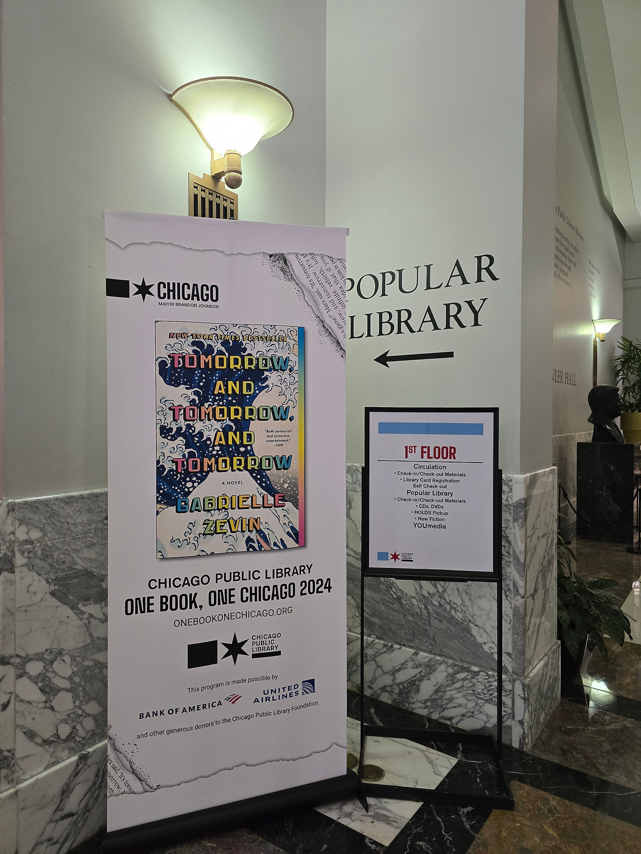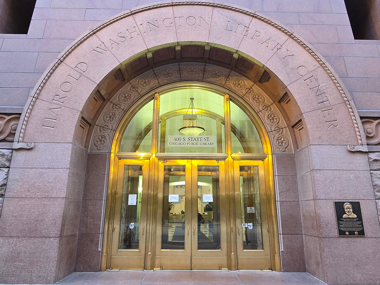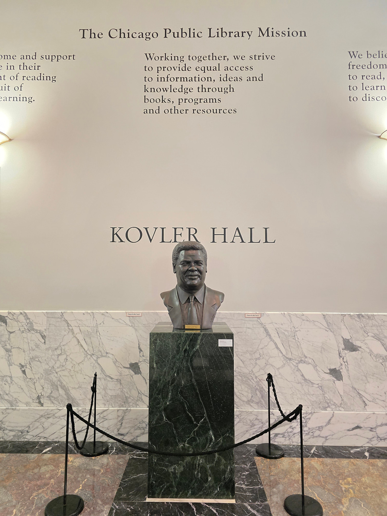 정문을 들어서면 해롤드 워싱턴 동상과 먼저 인사를 나눌 수 있다. 살짝 미소를 짓고 들어간다. 로비는 대리석 바닥과 둥근 금빛 난간, 개방감 있는 푸른 천장의 대칭적 구조가 돋보였다. 인포 데스크 벽면에는 미국 국기와 시카고 깃발이 걸려 있어 도서관의 상징성과 역사적 의미를 더해주었다. 국기가 걸려있으면 엄숙하고 질서를 잘 지켜야 할 것 같은 느낌이 든다.