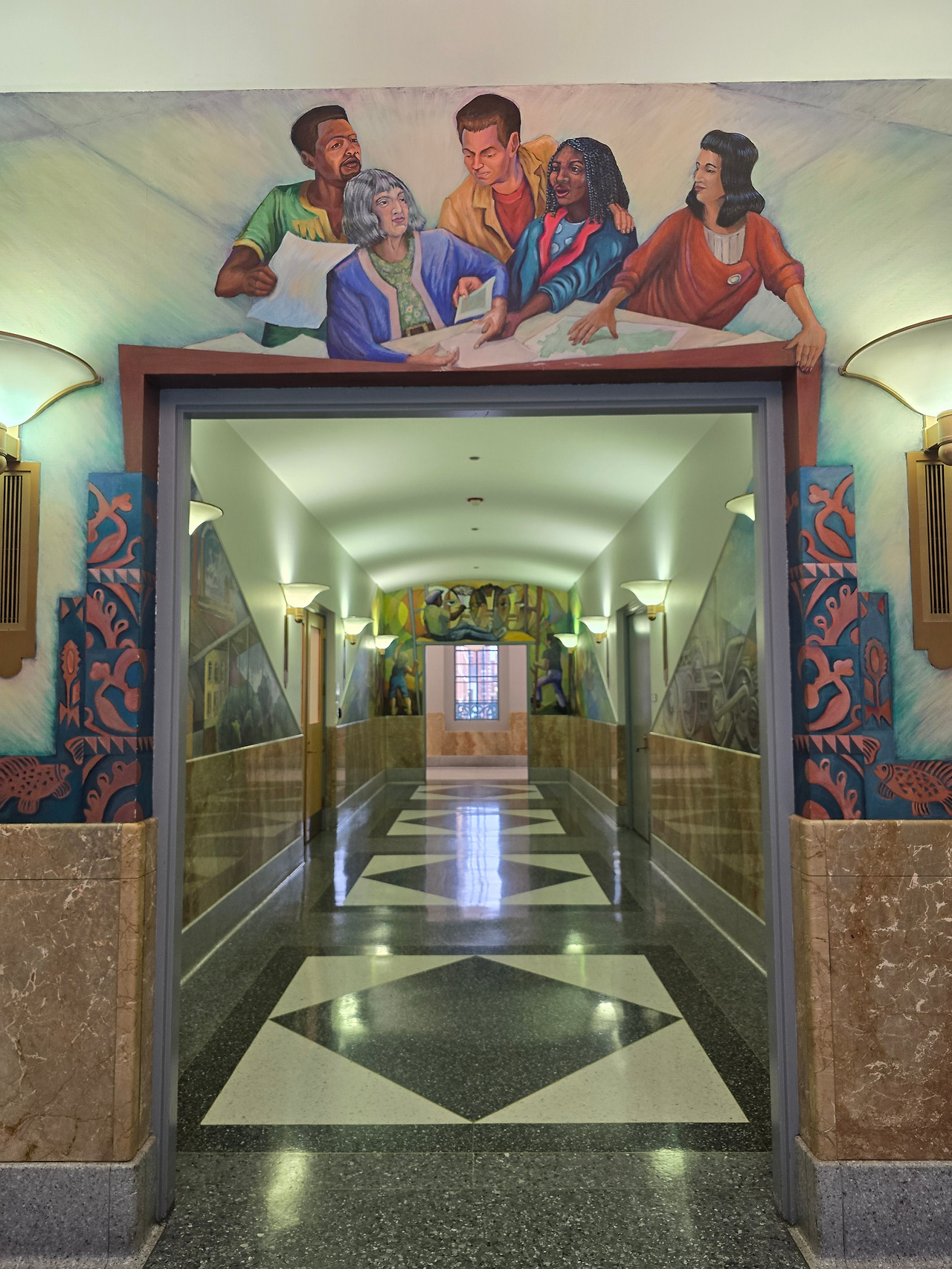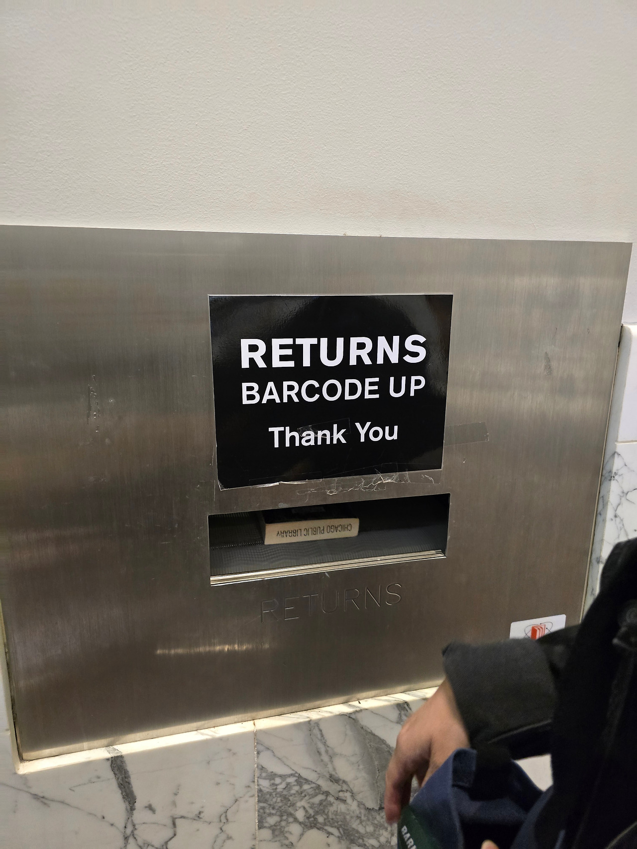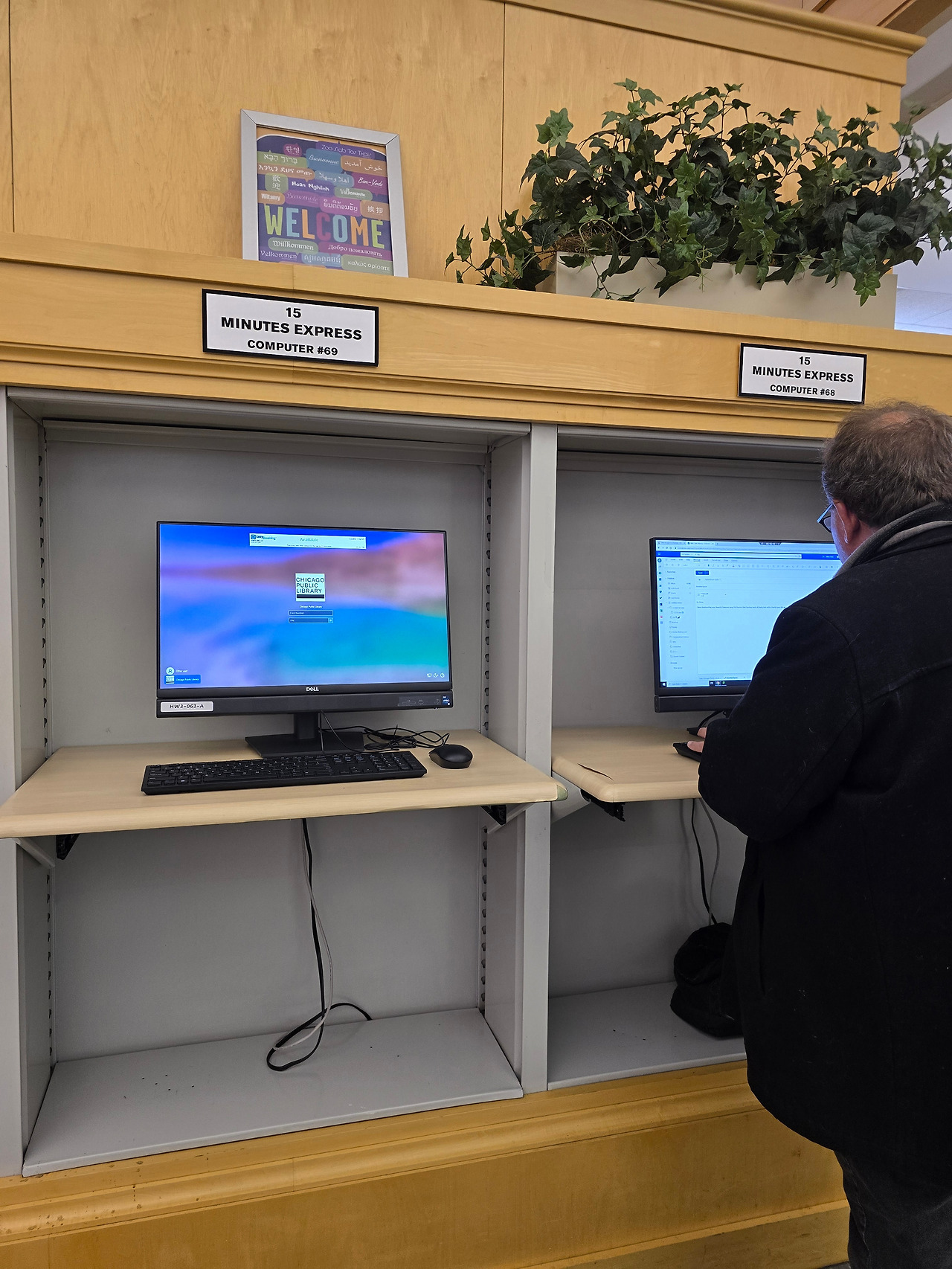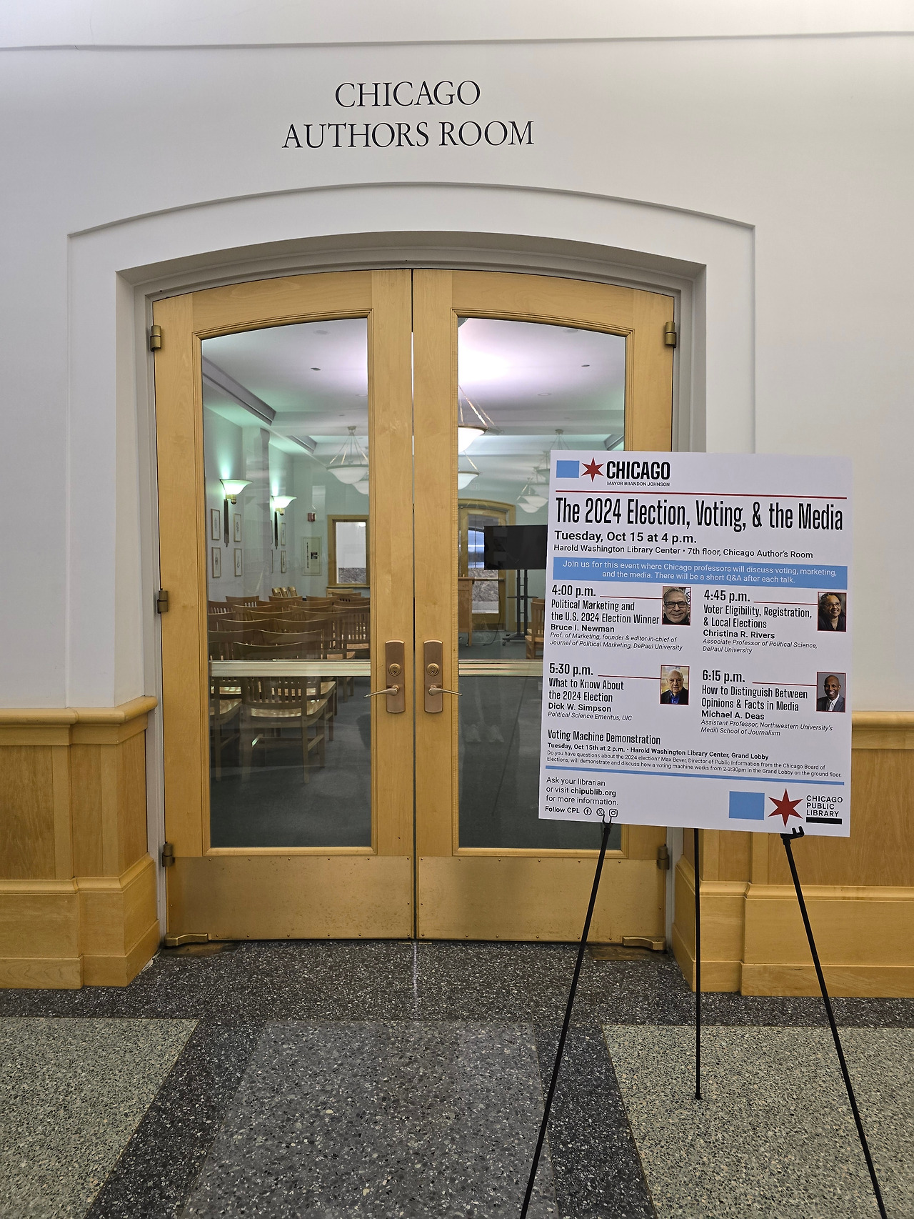 정문을 들어서면 해롤드 워싱턴 동상과 먼저 인사를 나눌 수 있다. 살짝 미소를 짓고 들어간다. 로비는 대리석 바닥과 둥근 금빛 난간, 개방감 있는 푸른 천장의 대칭적 구조가 돋보였다. 인포 데스크 벽면에는 미국 국기와 시카고 깃발이 걸려 있어 도서관의 상징성과 역사적 의미를 더해주었다. 국기가 걸려있으면 엄숙하고 질서를 잘 지켜야 할 것 같은 느낌이 든다.