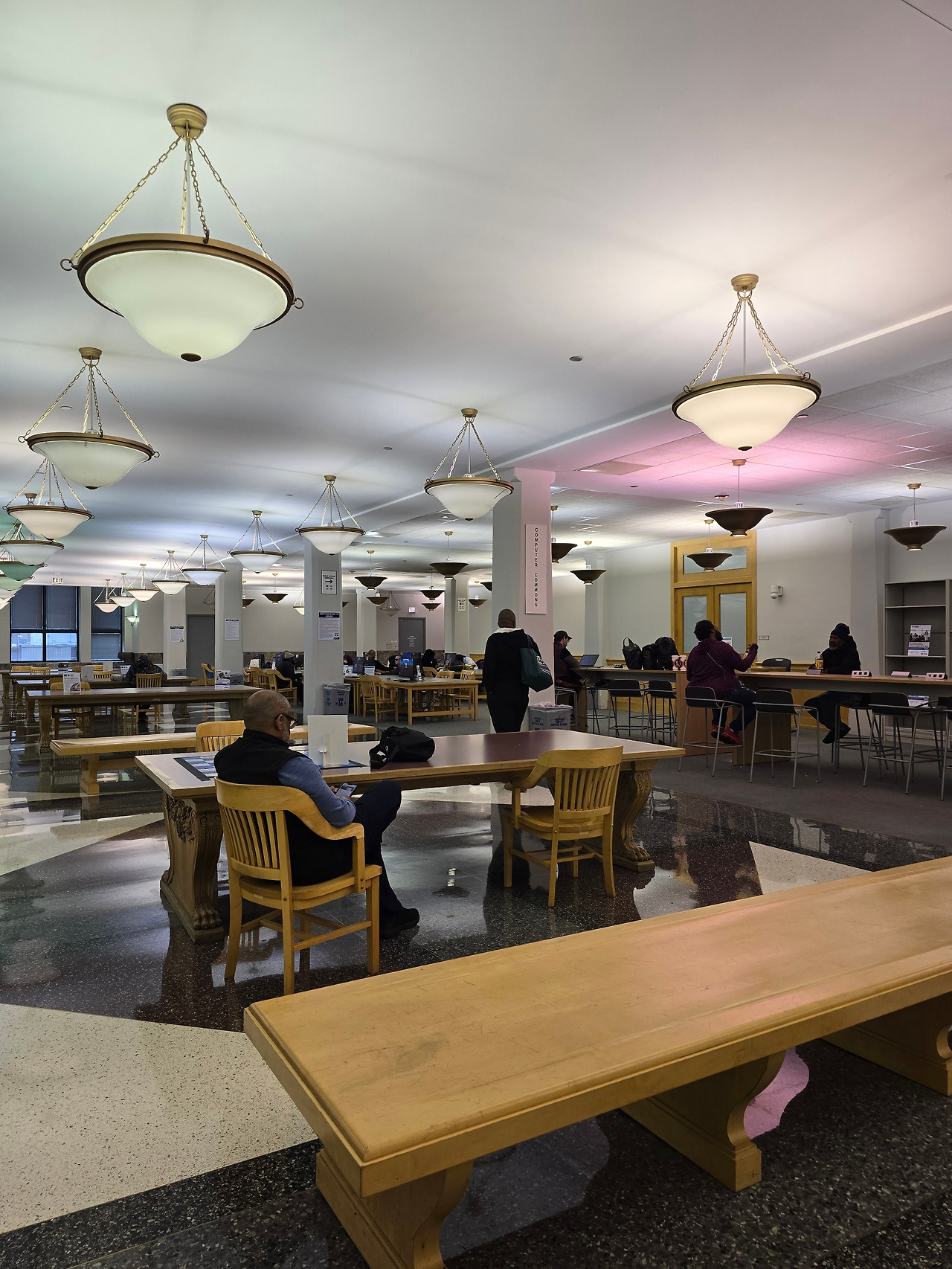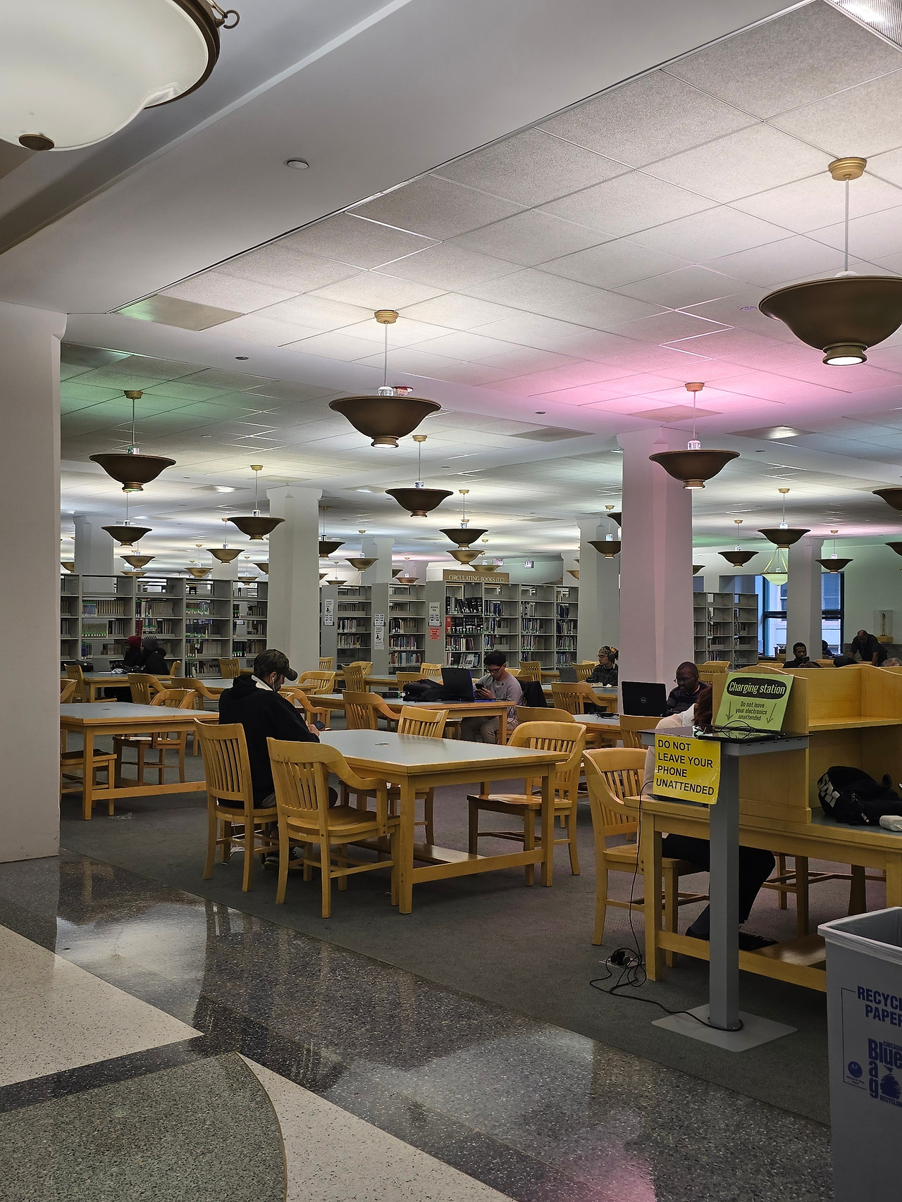 3층의 PC존(Computer Commons). 자세히 보면 PC가 설치된 라인은 조명이 덮혀있는데 빛의 강도와 빛 반사를 고려하여 의도적으로 설계한 디자인이라고 추측해본다. 테이블에 사람들이 빼곡하게 앉아 있어 이곳을 오래 사용할 엄두는 나지 않았다.