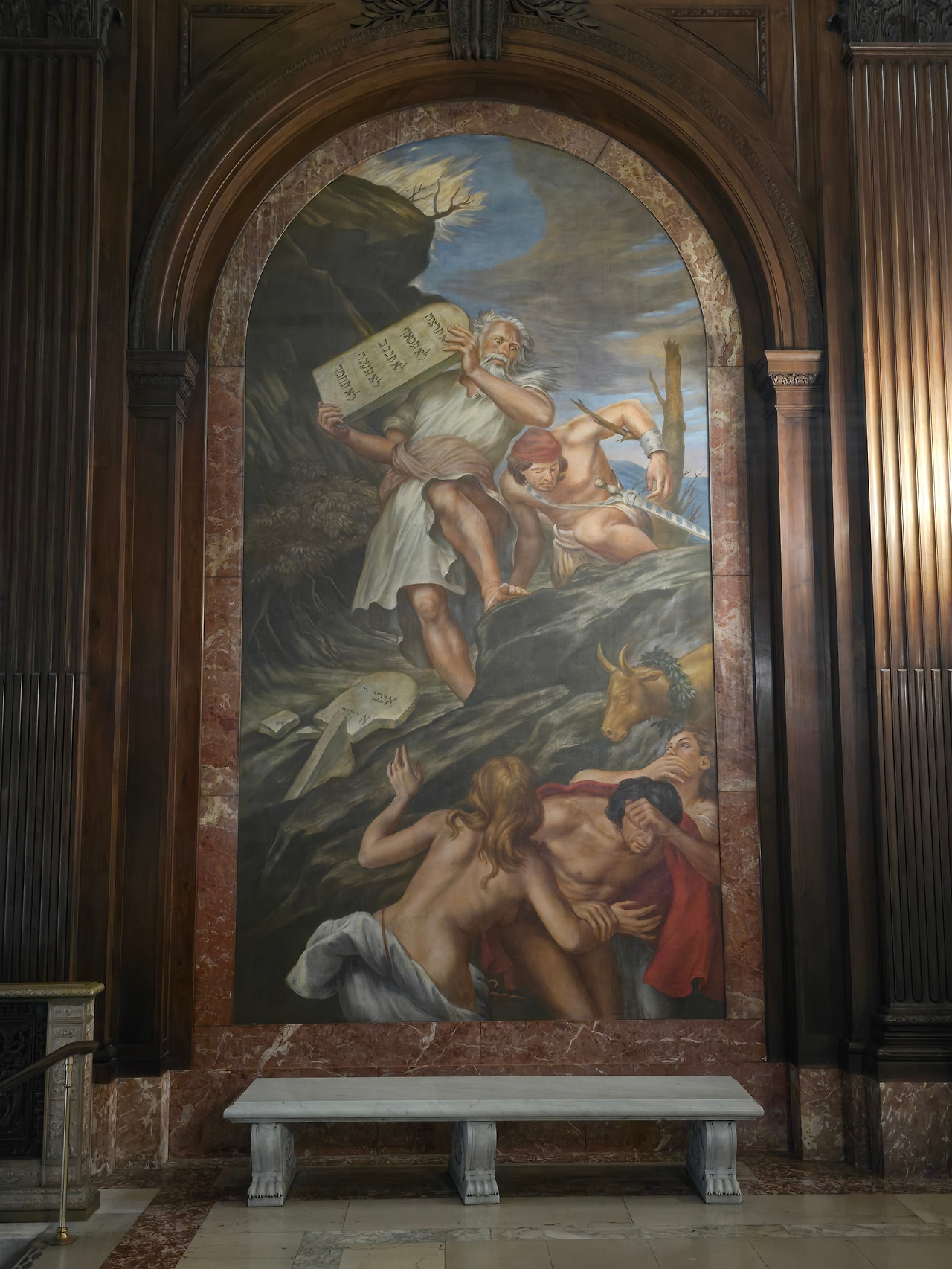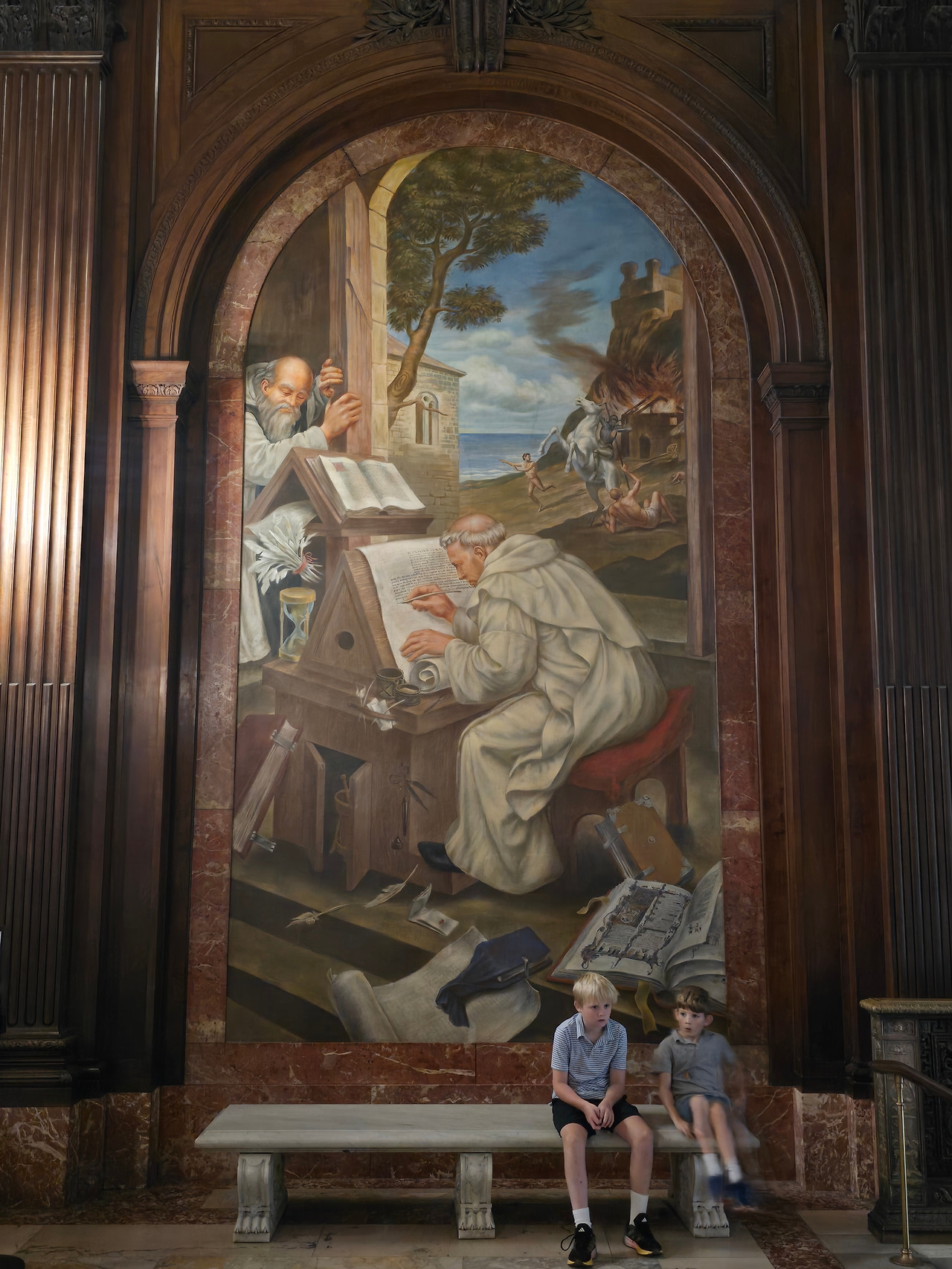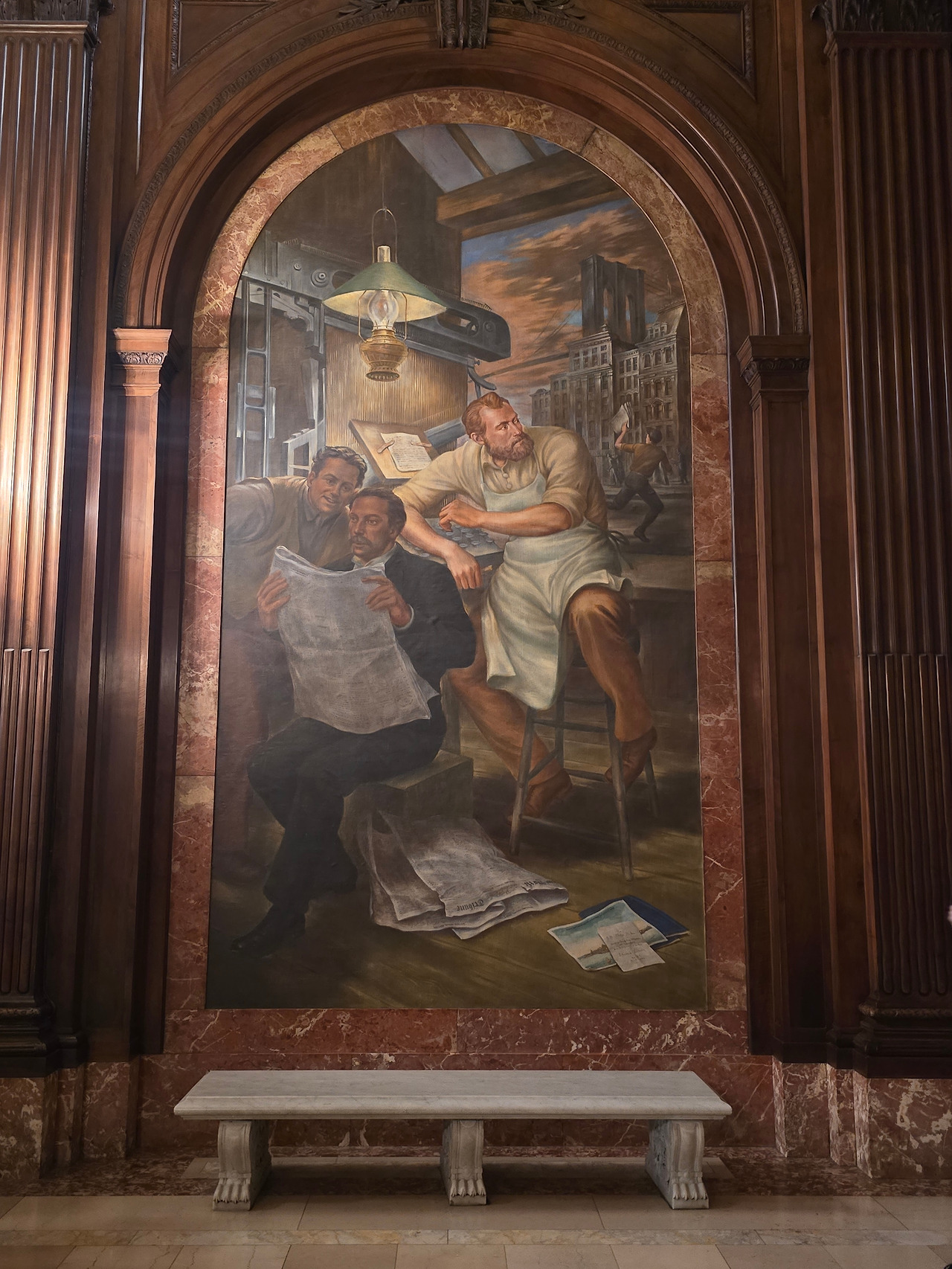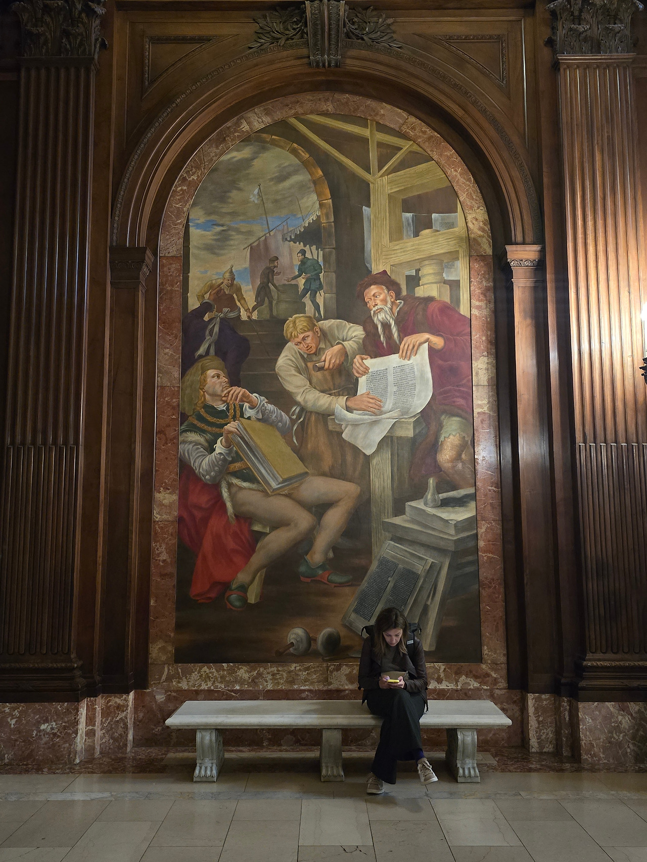 벽면엔 인류 문명의 기록 발전을 보여주는 4개의 대형 벽화가 그려져있다. 모세가 십계명을 받는 장면, 중세 수도사들의 필사 작업, 구텐베르크의 인쇄술 발명, 현대 출판 산업의 모습이다.