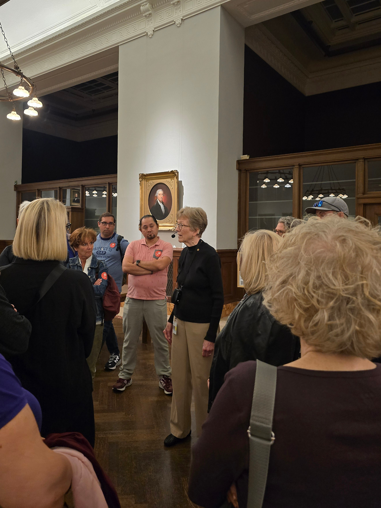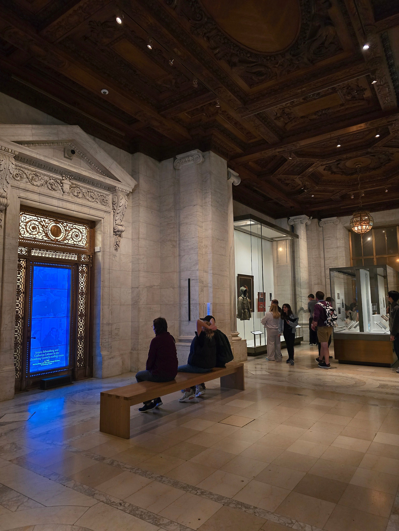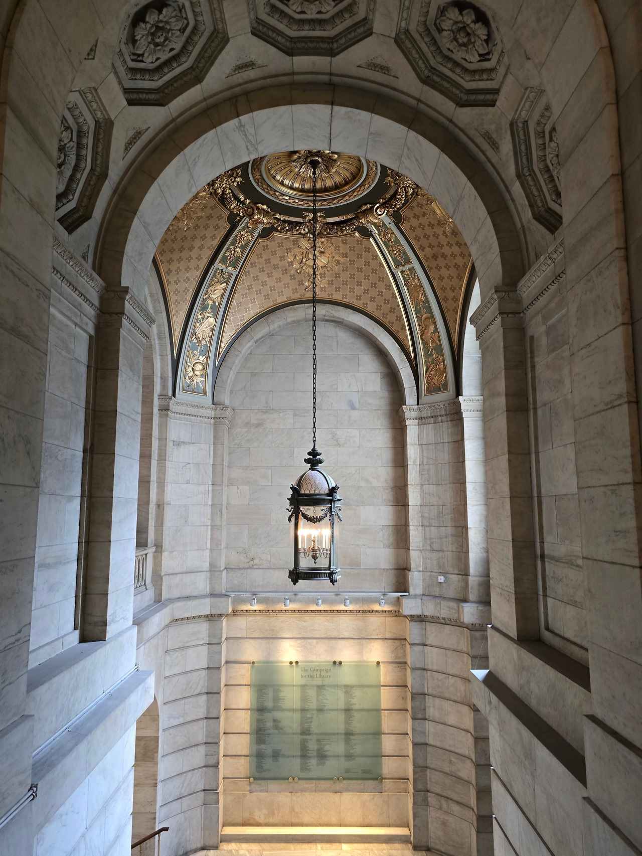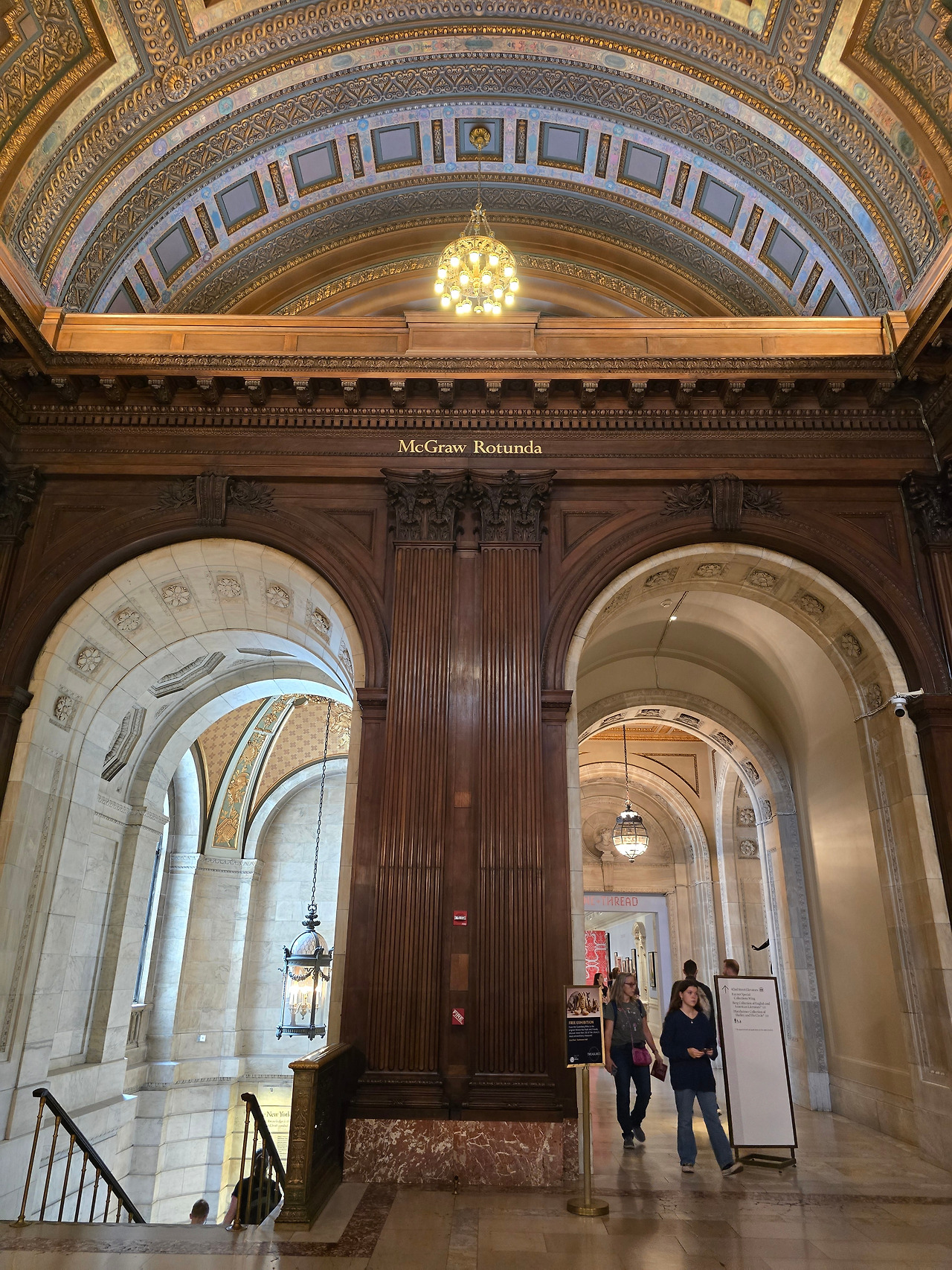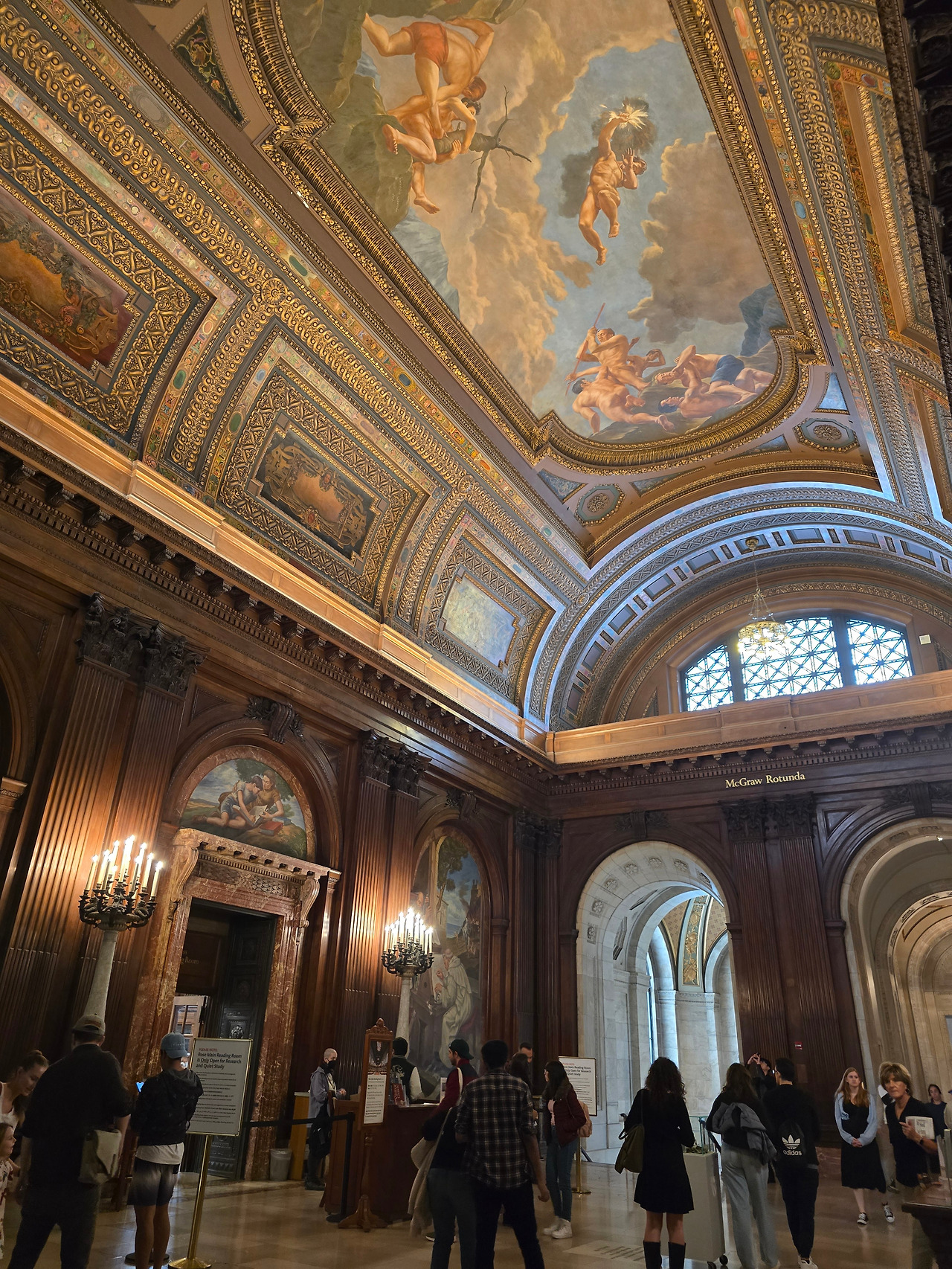 웅장한 계단을 감상하며 3층으로 올라가면 웅장함을 뛰어넘는 성스러운 공간, 맥그로 로툰다 원형 홀이 나온다. 천장엔 에드워드 라이닝(Edward Laning)이 그린 프레스코화가 보이는데, 프로메테우스가 인류에게 불을 가져다주는 장면으로 불은 지식과 계몽을 상징한다. 지식의 고귀함이 느껴지는 이곳 천장 아래에 서있는 것만으로도 지식 탐구의 에너지가 충전되는것 같았다.
