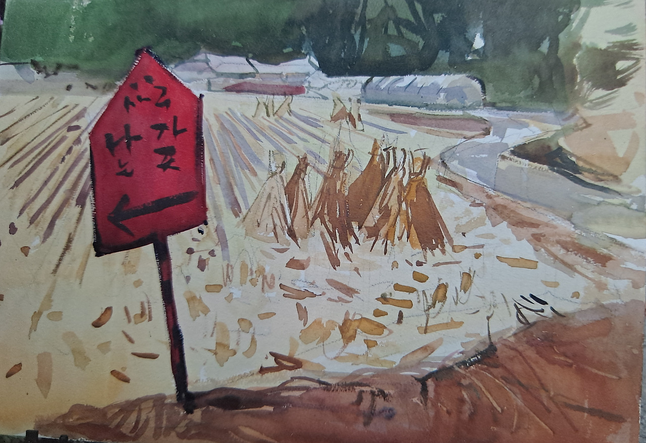 추수를 마친 황량한 들판 허수아비 대신 푯말이 서있다