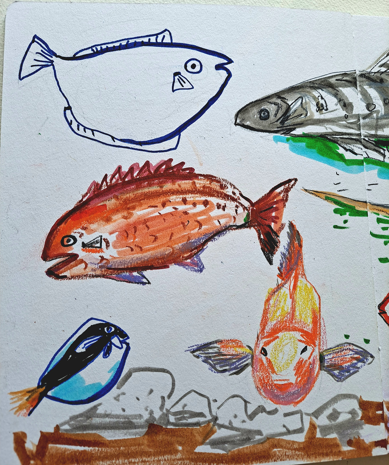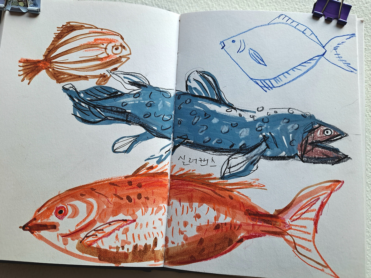 예전에 ‘물고기는 존재하지 않는다’라는 책을 읽었다. 제목만으로는 분류학 성격을 띤 과학책 같지만 사실 한 생물학자의 전기에 가까운 책이었다. 어쨌든 어류는 잘못된 분류라는 학설에 그때는 고개를 끄덕였지만 지금 내 생각은 아니다. ‘물고기는 존재한다’. 내 눈앞에서, 내 그림 속에서 뿜뿜 존재감을 내뿜는 이것이 물고기가 아니면 무엇이란 말인가. 그리면서 잠시 물고기에게 감정이입이 되는 것은 덤, 눈에 보이는 세상을 그리면서 그 속의 보이지 않는 세상을 갸늠한다. (졸저 ‘그림을 쓰다’의 이유). 어반스케치는 계절을 타지 않는다. 성수기, 비수기 대신 겨울(여름) 특수가 있을 뿐. 겨울도 막바지, 요즘 내 마음은 방학은 끝나가는데 숙제가 밀려있는 아이들 마음 같다. 문제는 급한 마음에 따라가지 못하는 몸, 그것 또한 ‘어쩔 수가 없다’.