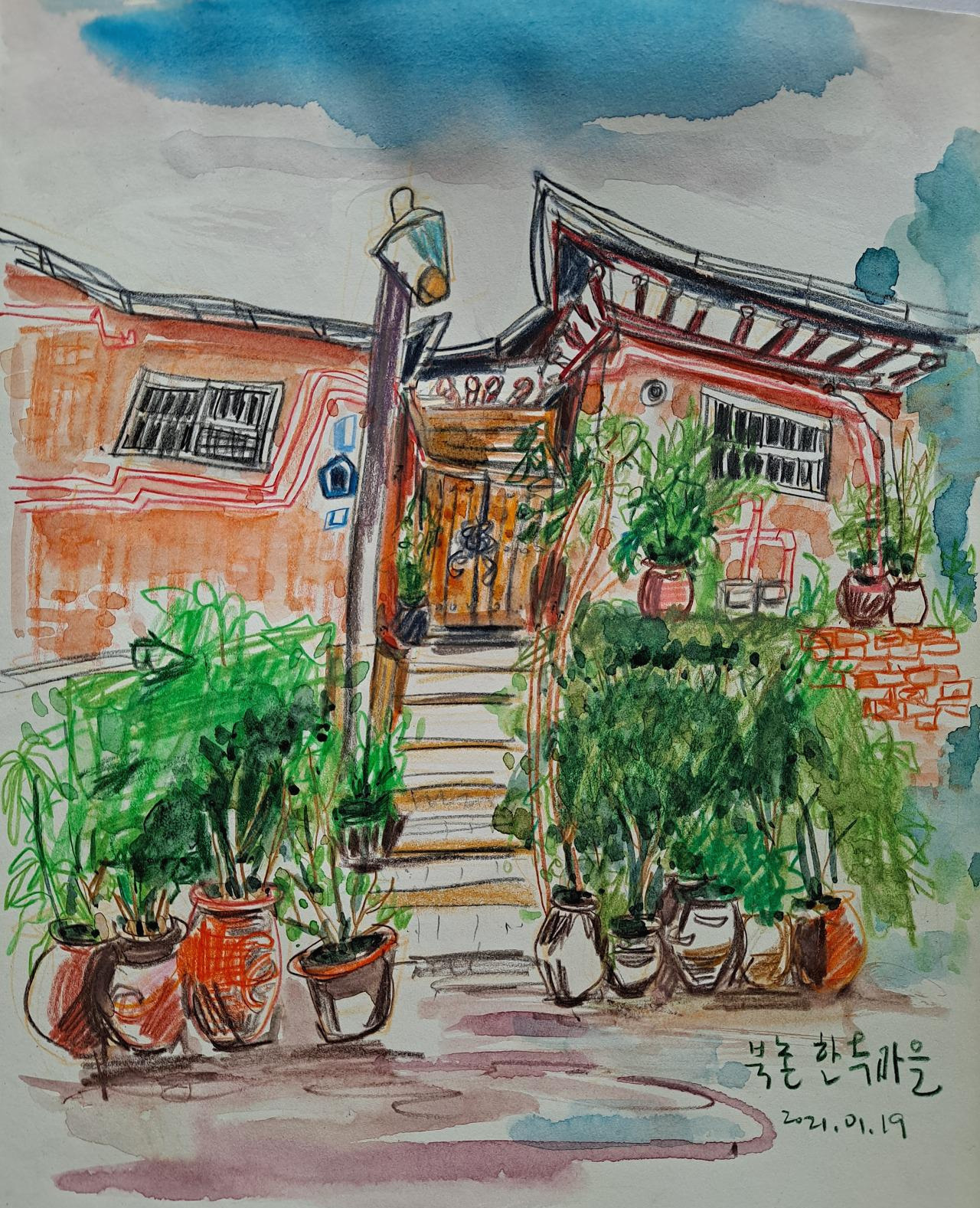 오르막 내리막 휘어진 골목길을 따라 겹쳐지는 기와지붕을 보러 북촌 한옥마을에 갔다가 오래된 계단 집을 만났다.