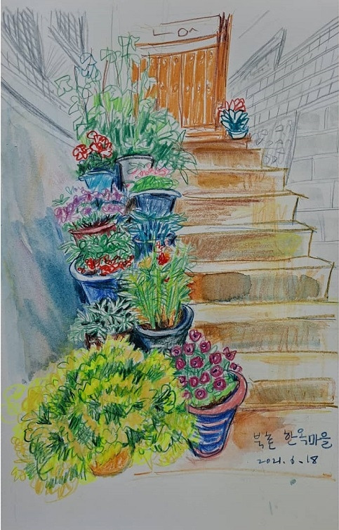 아스라이 올려다 보이는 대문 아래 가파른 계단은 비장감마저 들게 하지만 층층이 놓인 화분에 나도 모르게 발걸음이 움직인다. 꽃잔치에 초대받은 손님 인양 각양각색의 꽃들과 눈을 맞추고, 안부를 나누다 보니 어느새 문 앞, 내려다 보이는 계단 꽃밭은 그 사이 자리를 바꿔 앉은 개구쟁이들처럼 새로운 모습을 보여준다.