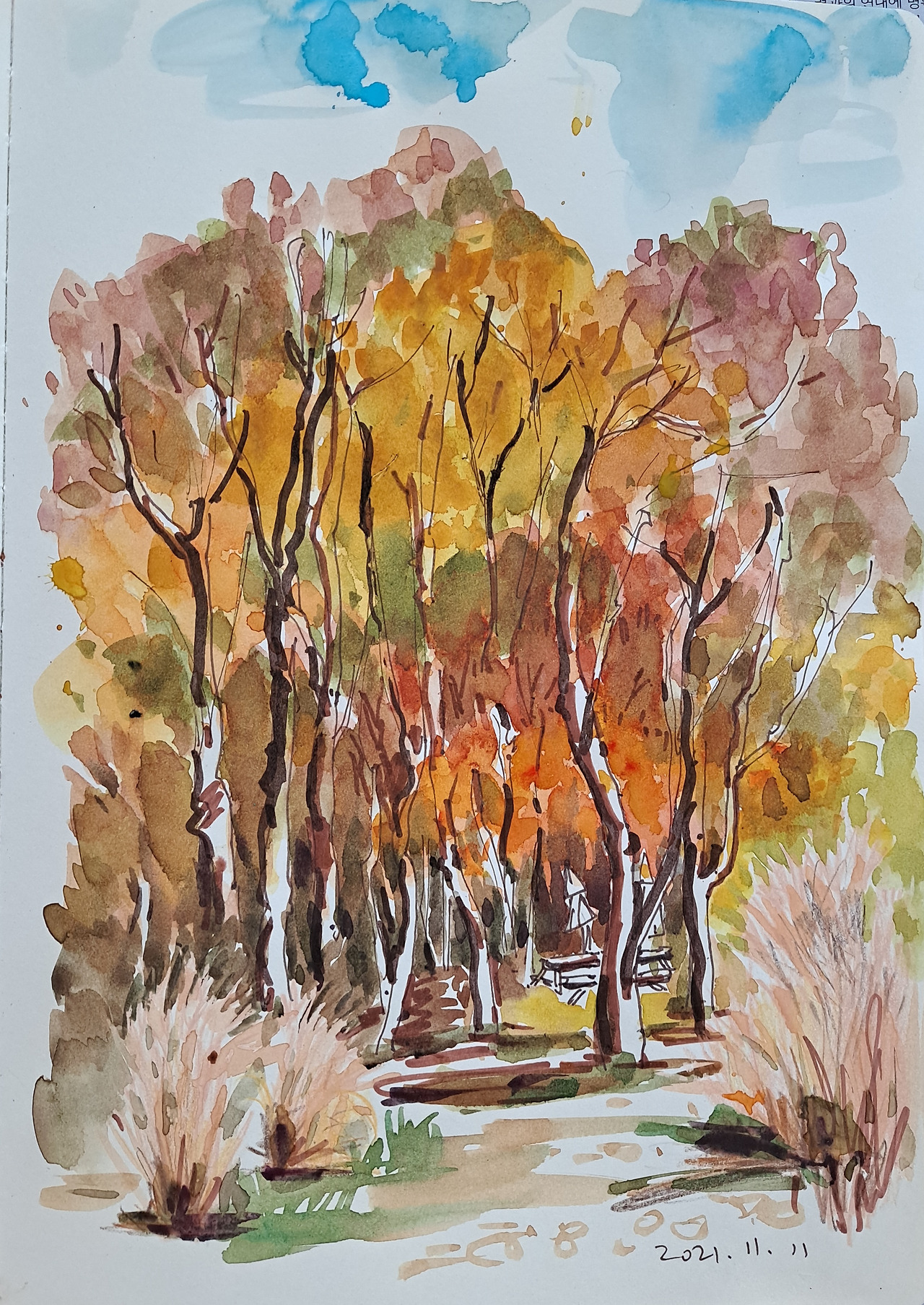눈앞을 가로막는 강렬하고, 오묘한, 무어라 표현할 수 없는 색감은 여타의 감정이나 생각에 우선하여, 단풍을 빼고는 그릴 것도, 쓸 것도, 생각할 것도 없는 시간이 지루하리만치 이어지고 있다.