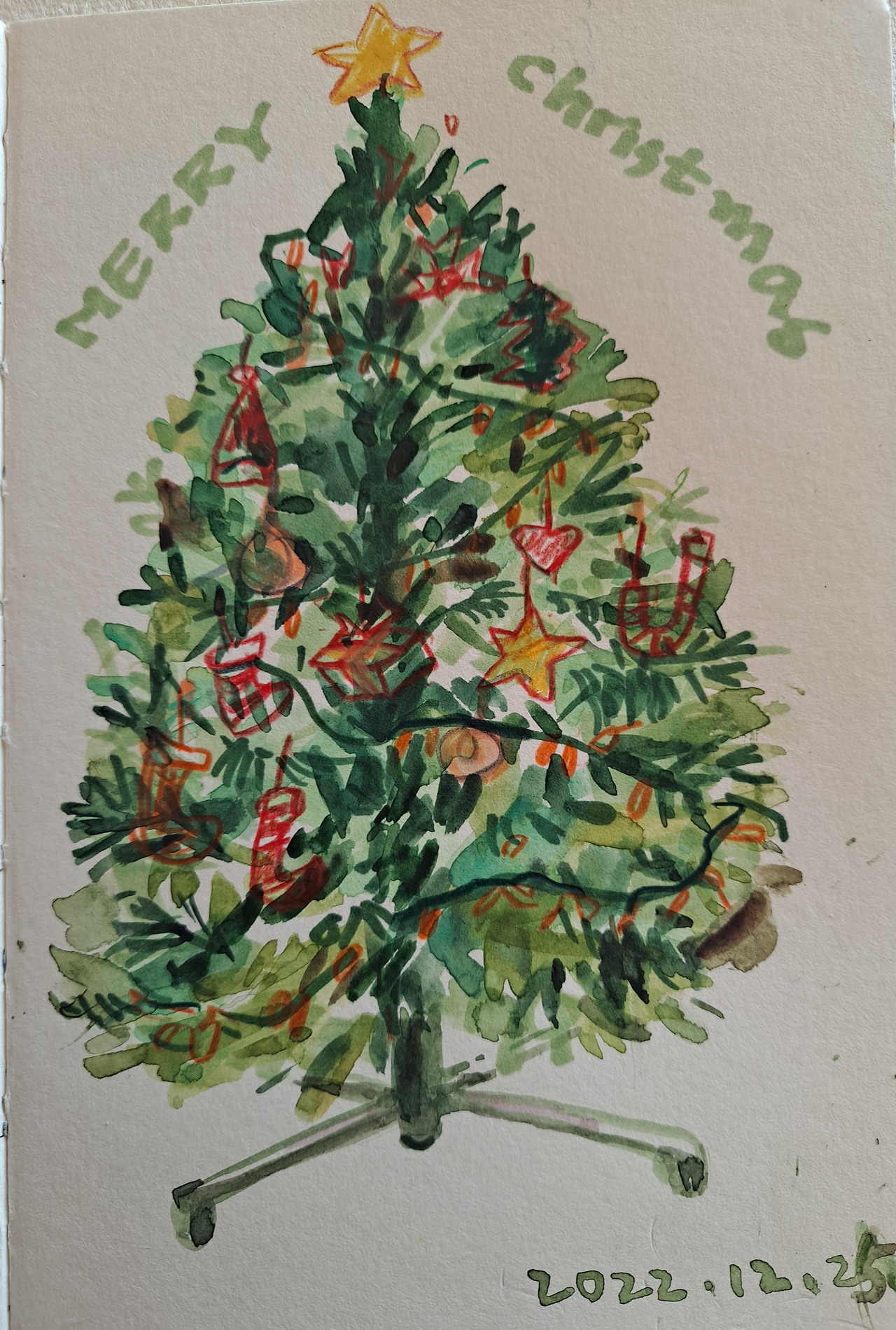 성탄절의 백미인 캐럴, 거리와 상점이 떠나갈 듯 울려 퍼지던 캐럴송은 저작권 문제와 개인적 취향의 존중으로 볼륨을 줄였지만 코로나로 숨죽여야 했던 3년을 만회하듯 크리스마스트리는 더 휘황찬란하게 몸집을 불린듯하다. 누가 누가 더 화려한가 내기라도 하듯 자태를 뽐내는 트리를 보니, 반짝이 색종이로 만든 별, 종, 양말, 지팡이, 선물상자. 꼬마전구 그 정도로 충분했던 예전의 소박한 트리가 생각났다. 요즘 크리스마스는 기념일이라기보다 거대한 시장 속 하나의 상품이 되어가고 있지만, 각자의 방식과 볼륨으로 캐럴을 즐기고 좋아하는 장식으로 트리를 꾸미며 나름의 크리스마스를 느끼는 것. 크리스마스의 기적뿐 아니라 크리스마스의 악몽까지 껴안는, 크리스마스의 본질은 그런 것이 아닐까. 예전의 소박한 트리를 그리면서 떠들썩한 축제가 되어가는 크리스마스가 안따까워 버릇처럼 '그림을 쓰다'보니 이미 크리스마스는 지나버렸다. 하지만 크리스마스는 끝나지 않고 계속되는 것이라고.. 습관성 핑계대기로 마무리할 수밖에.
