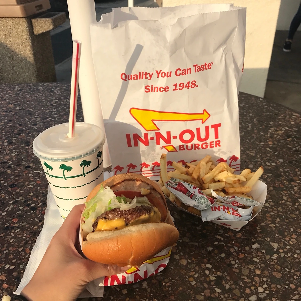 인앤아웃에 도착하니 점심시간이 지났음에도 많은 사람들이 줄 서있었고, 나는 치즈버거와 프라이, 밀크셰이크를 받아 자리가 있는 야외로 나왔다. 사람이 아무도 없는 테이블에 주차장 쪽을 바라보며 앉았고, 햇볕에 눈이 부셔 선글라스를 끼고 햄버거를 먹기 시작했다.