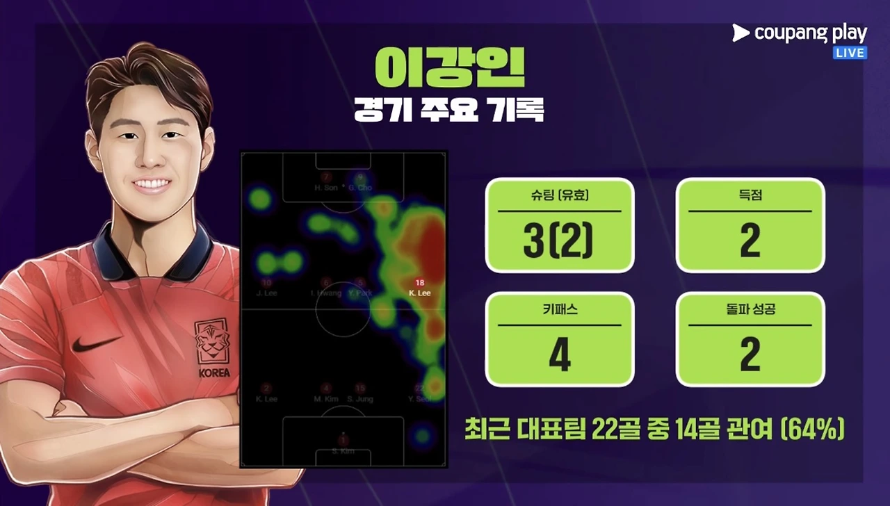 골을 두 개나 넣고(멀티골 기록), 강인이의 주특기인 적재적소 미친 침투패스, 스루패스, 드리블 및 탈압박 등을 보여주며
