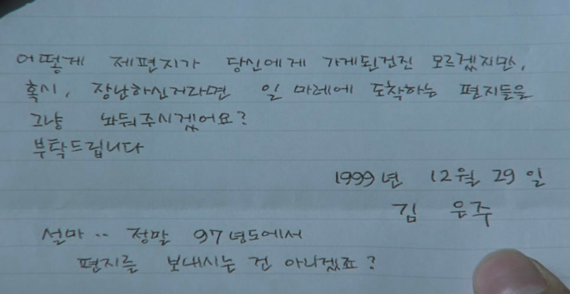 ‘일마레’라는 이름의 집… 1997년 12월, 성현은 일마레 집 앞 빨간 우체통에서 1999년 12월, 그러니까 2년 뒤인 미래에서 은주가 보낸 편지를 받게 돼. 성현은 답장을 하고, 은주 역시 또 답장을 하고… 그렇게 둘은 뒤틀린 시간 속, 빨간 우체통을 통해 편지를 주고 받지. 때로는 작은 선물까지도. 서로의 이야기를, 마음을 나누던 어느 날… 지하철 역, 성현은 은주를 알아보게 되고.