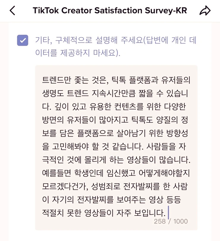 수없이 많은 유행과 챌린지 속에서 틱톡에게 하고 싶은 말을 설문조사 기타란에 적었다.
