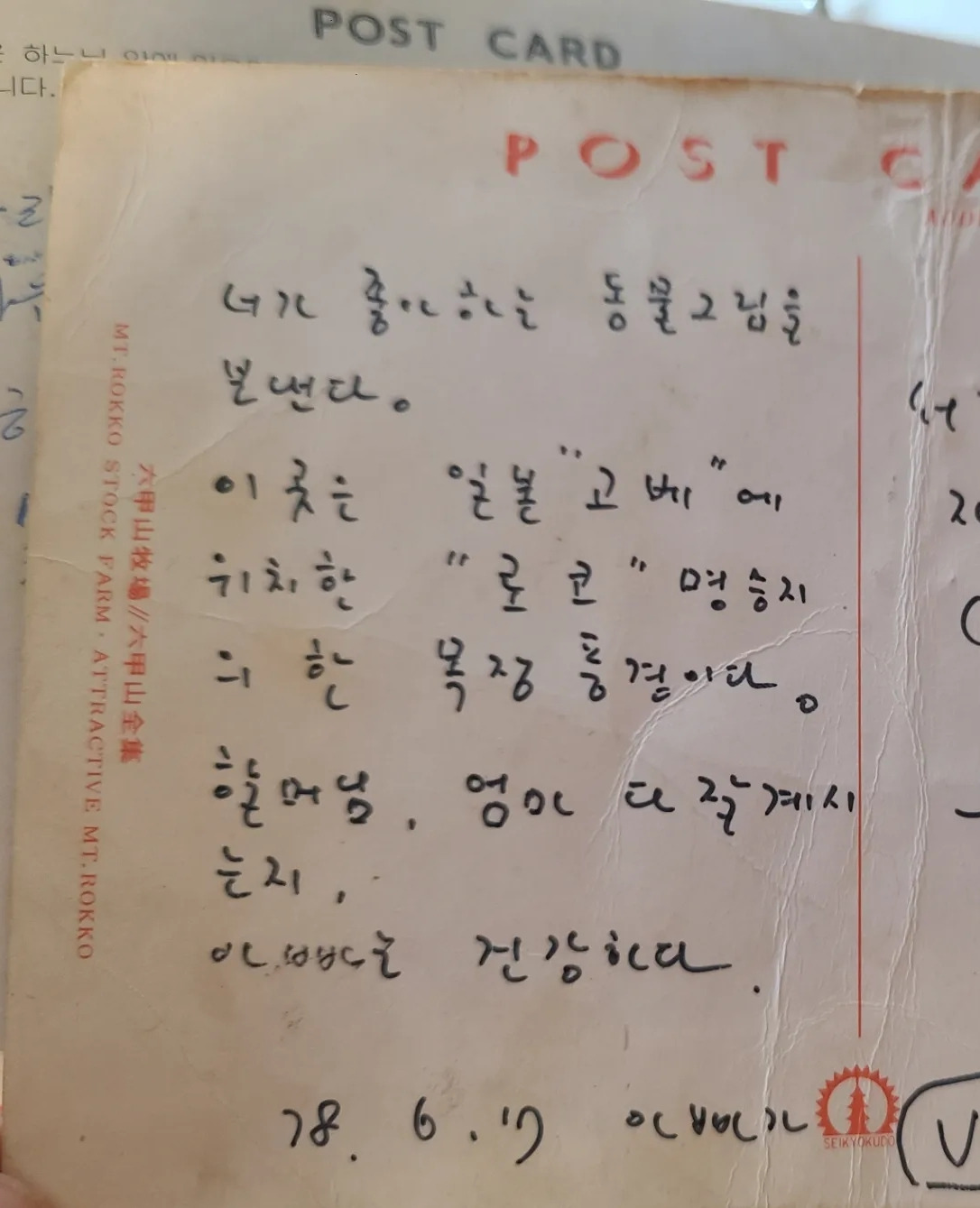 1978년도 6월, 일본에서 보낸 아빠의 엽서, 동물을 좋아한다고 젖소 사진을 보내주셨다.