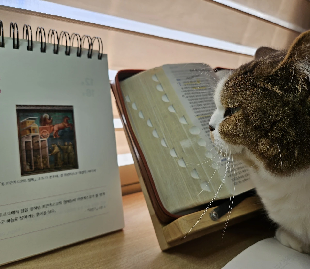 종이류, 박스류 위에 앉는 것을 좋아하는 고양이들의 습성상, 노트가 따뜻하고 편한 방석인 양 자연스럽게 앉아버린다. 그리고 책상 위의 '프란치스코 성인과 함께하는 묵상 달력'으로 시선을 보낸다.
