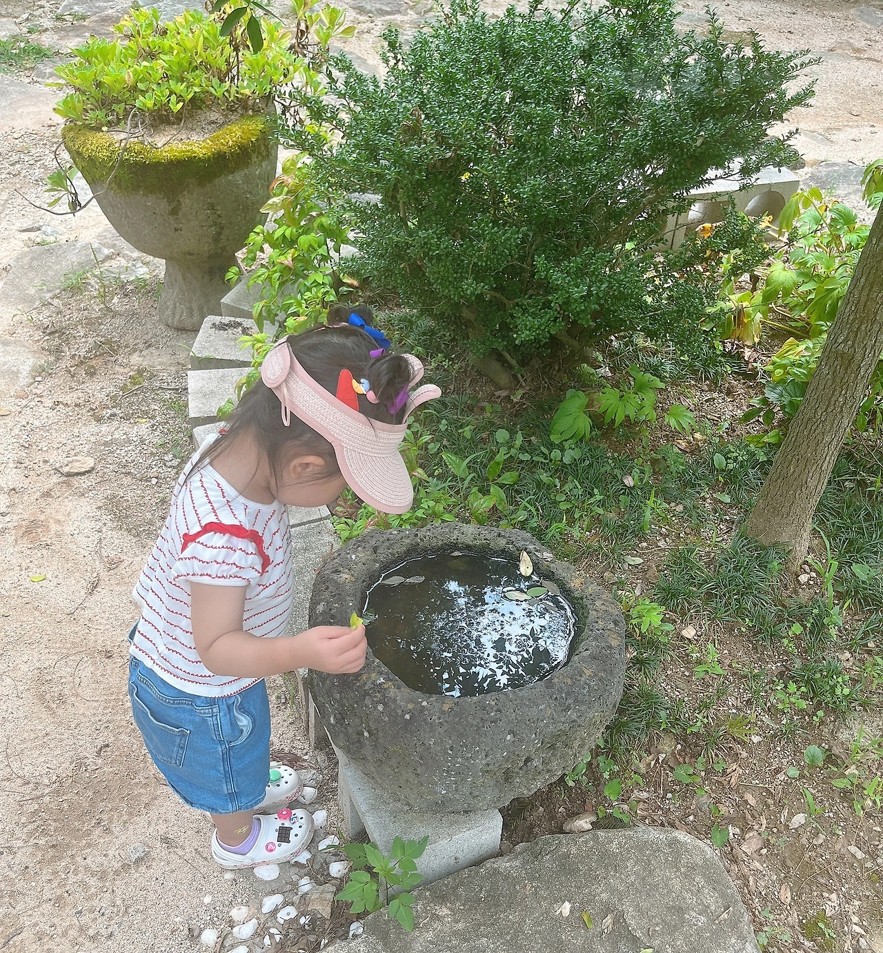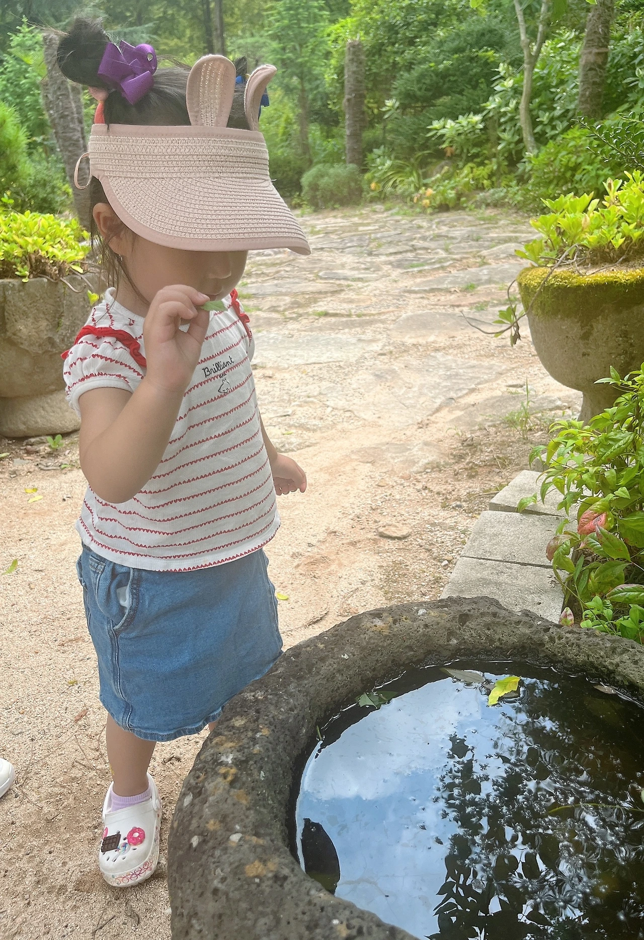 아직 자연 풍경을 감상하는 것은 관심 없는 우리 수지는 그래도 이 속에서 자기만의 즐거움을 찾아서 행복을 챙겼다. 물만 보면 늘 나뭇잎 배를 띄우는 우리 수지는 오늘도 어김없이 물에 나뭇잎 배를 띄우며 즐거워했다. 정말 순수한 아이의 모습을 볼 수 있는 것이 행복하다. 그 순간의 그 모습이 얼마나 사랑스러운지, 더위도 잠시 잊고 아이에게 집중했다.