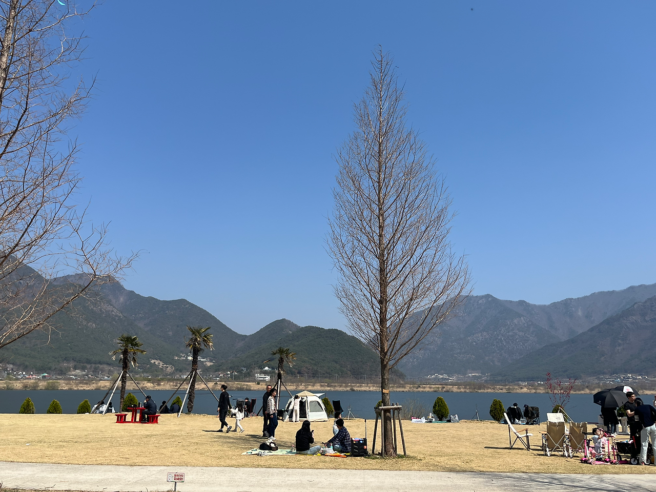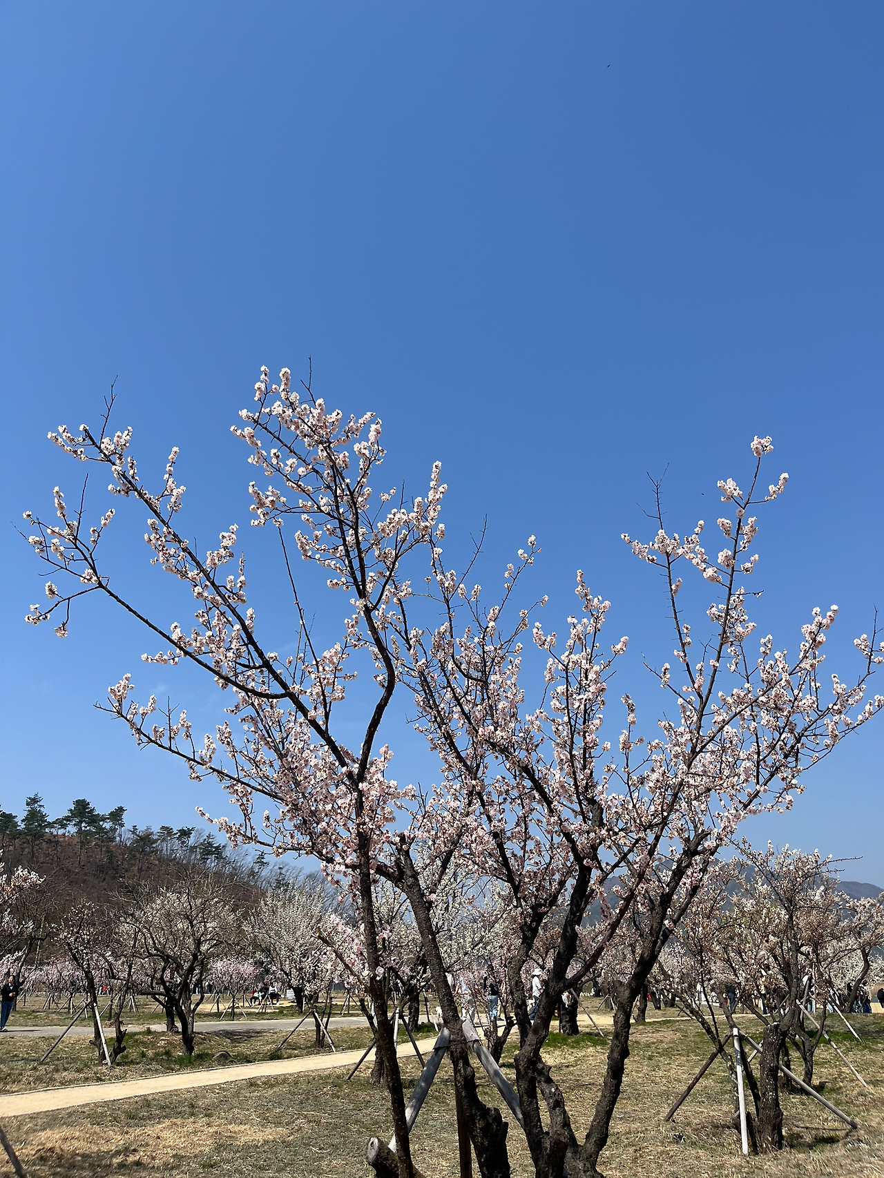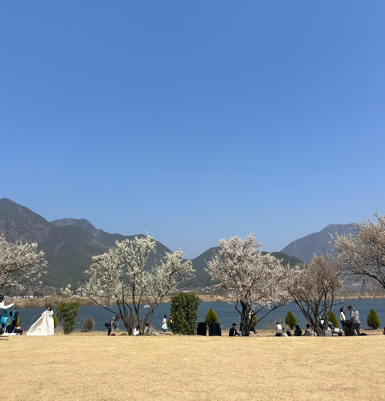 이 풍경을 보니 ‘봄축제’에 온 기분이 들었다. 이 공원에서 특별히 축제를 하고 있는 건 아니었지만 파란 하늘, 푸른 강, 강 뒤에 병풍처럼 펼쳐진 산과 흐드러지게 핀 매화꽃, 그리고 이 자연 속에서 웃고 있는 사람들의 풍경은 그야말로 '봄' 이었다. 봄을 형상화한다면 딱 이런 모습이겠구나 싶은 느낌이었다.