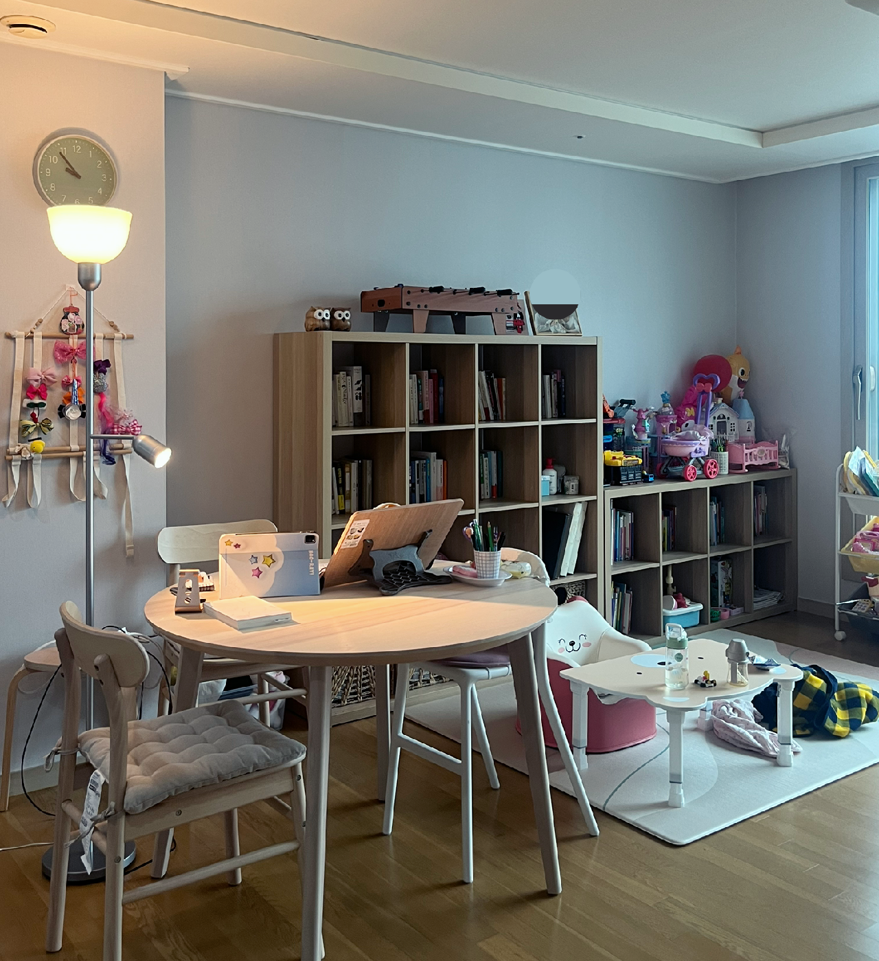 이번에 이사하면서 가장 변화를 크게 준 곳은 거실이었다. 기존에 있던 소파를 과감히 없애고 그 자리에 책장과 테이블을 뒀다. 책장은 4단 하나, 2단 하나로 주문했다. 4단짜리에는 내 책과 물건, 우리 가족들이 공용으로 쓰는 물건을 넣어놓고 2단짜리에는 수지 책과 장난감등을 넣어놓았다.