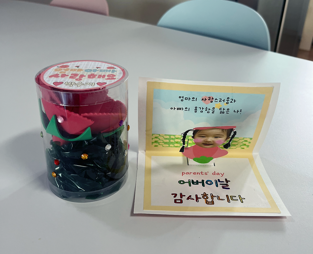 몇 년 전, 수지가 어버이날에 처음 선물을 줬던 날은 특히 잊지 못한다. 내가 어버이날에 선물을 받는 부모가 됐다는 것을 의식도 못하고 있었다. 그런데 어느 날 하원하러 갔더니 수지가 어버이날이라고 카네이션과 선물을 만들어 온 것을 보고 '아, 오늘 어버이날이었구나! 내가 어버이구나!' 하며 내가 부모인 것을 실감했다.