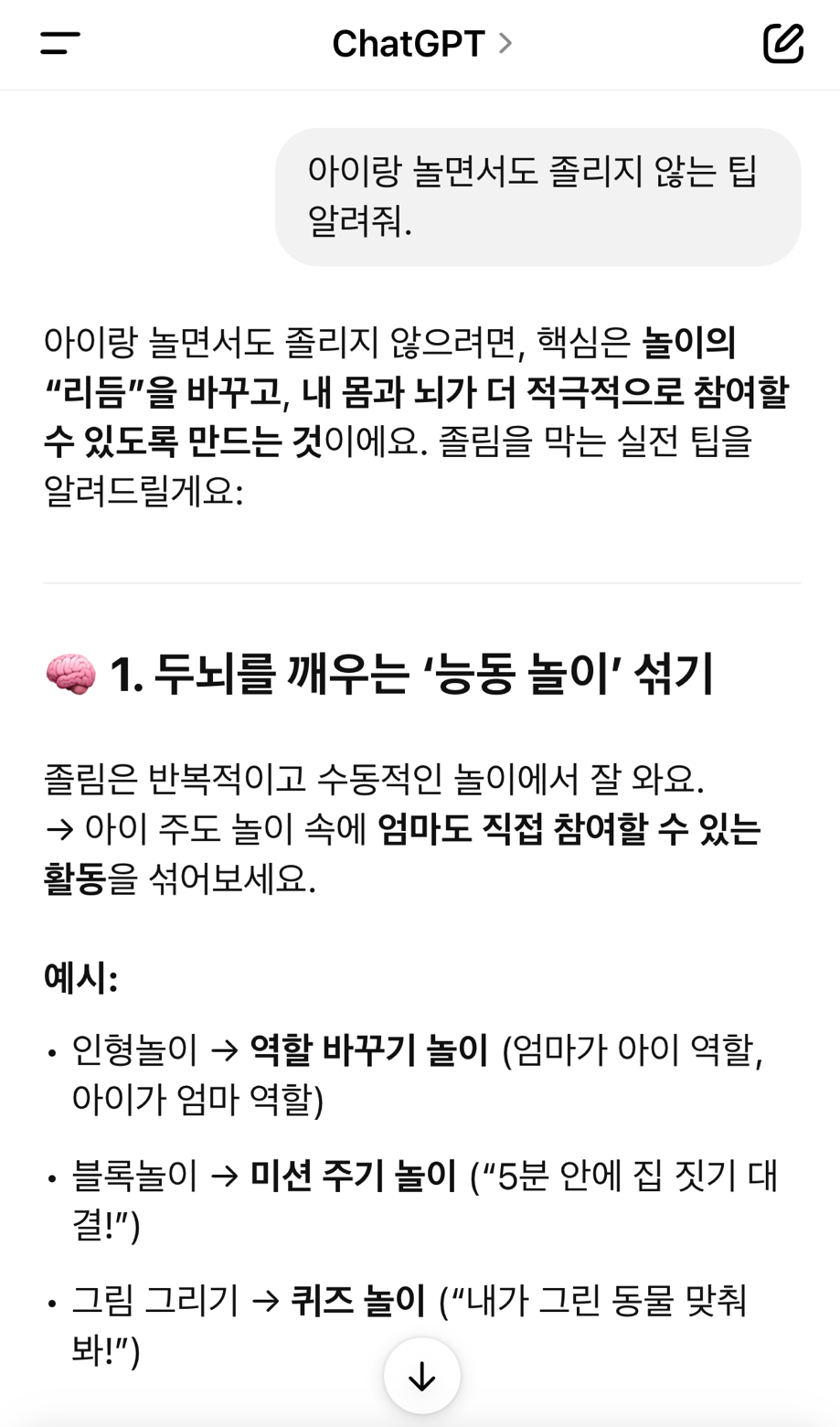 그리고 수지랑 같이 하는 놀이방식을 조금 바꿔봐야겠다는 생각이 들었다. 그래서 이것도 챗지피티에게 물어보았다.