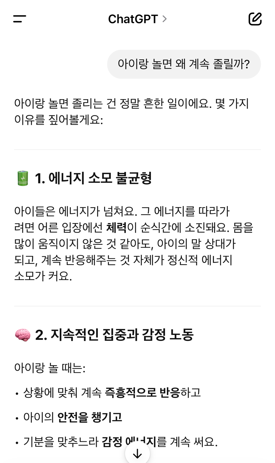 수지가 너무 고맙고 기특하면서도 미안했다. 그리고 아이랑 놀면 왜 졸린지 챗지피티에게 물어봐야겠다는 생각이 문득 들었다.